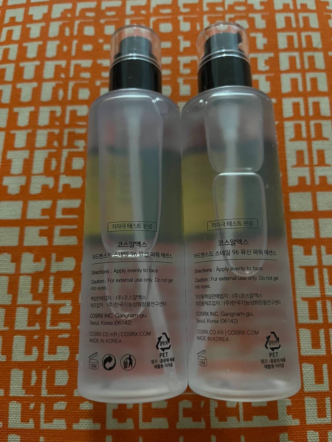 Selling two bottles of COSRX Advanced Snail 96 Mucin Power Essence. Each bottle is 100 mL (3.38 fl. oz.). Apply evenly to face for smoother, healthier skin. Made in Korea.