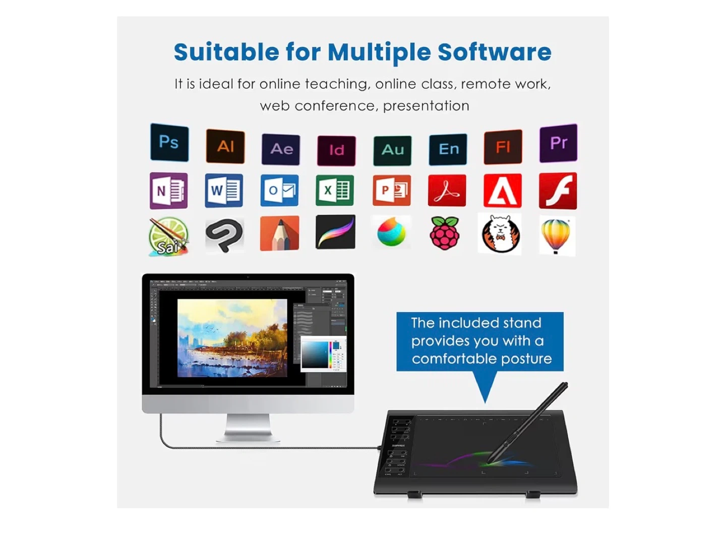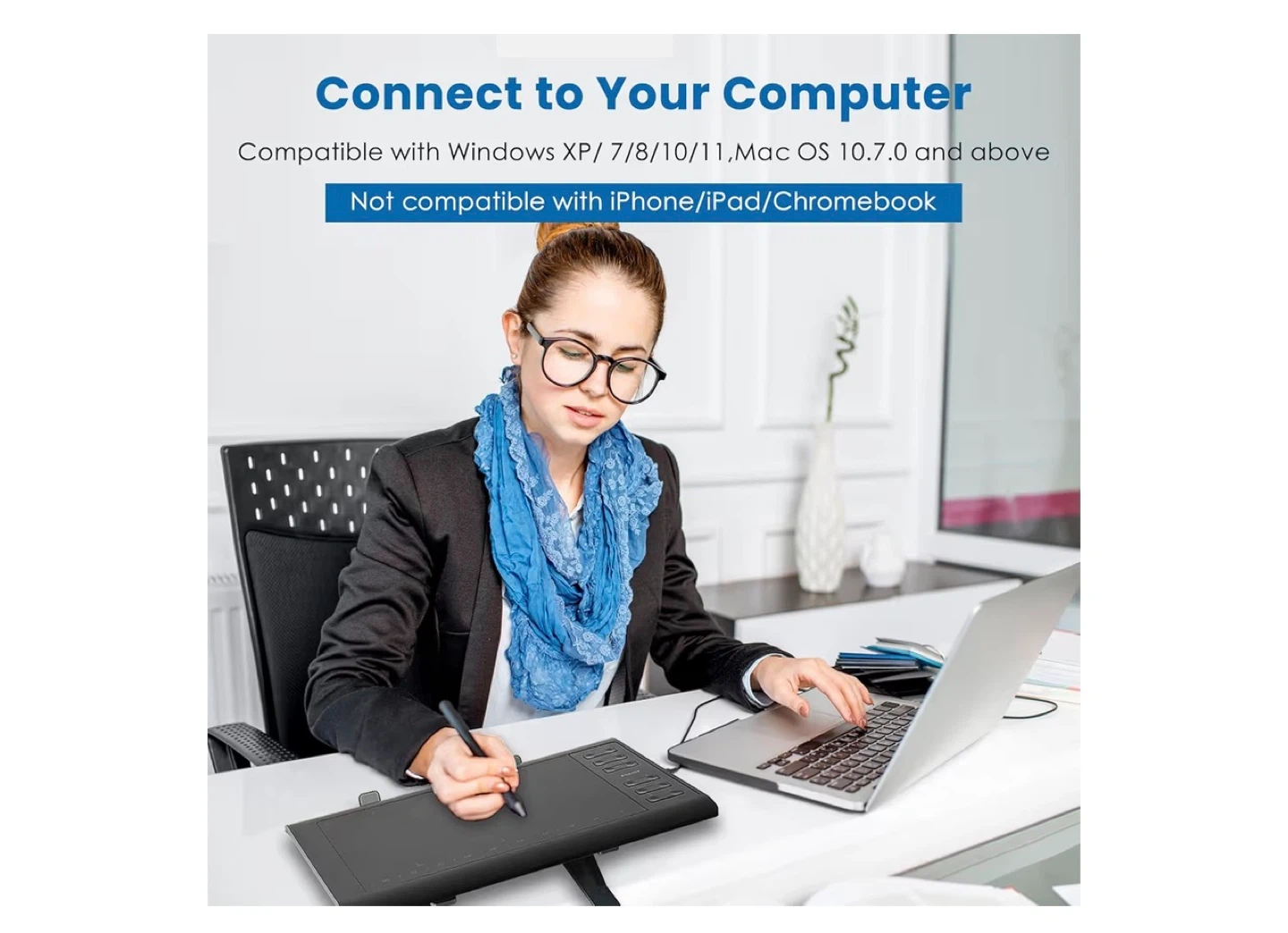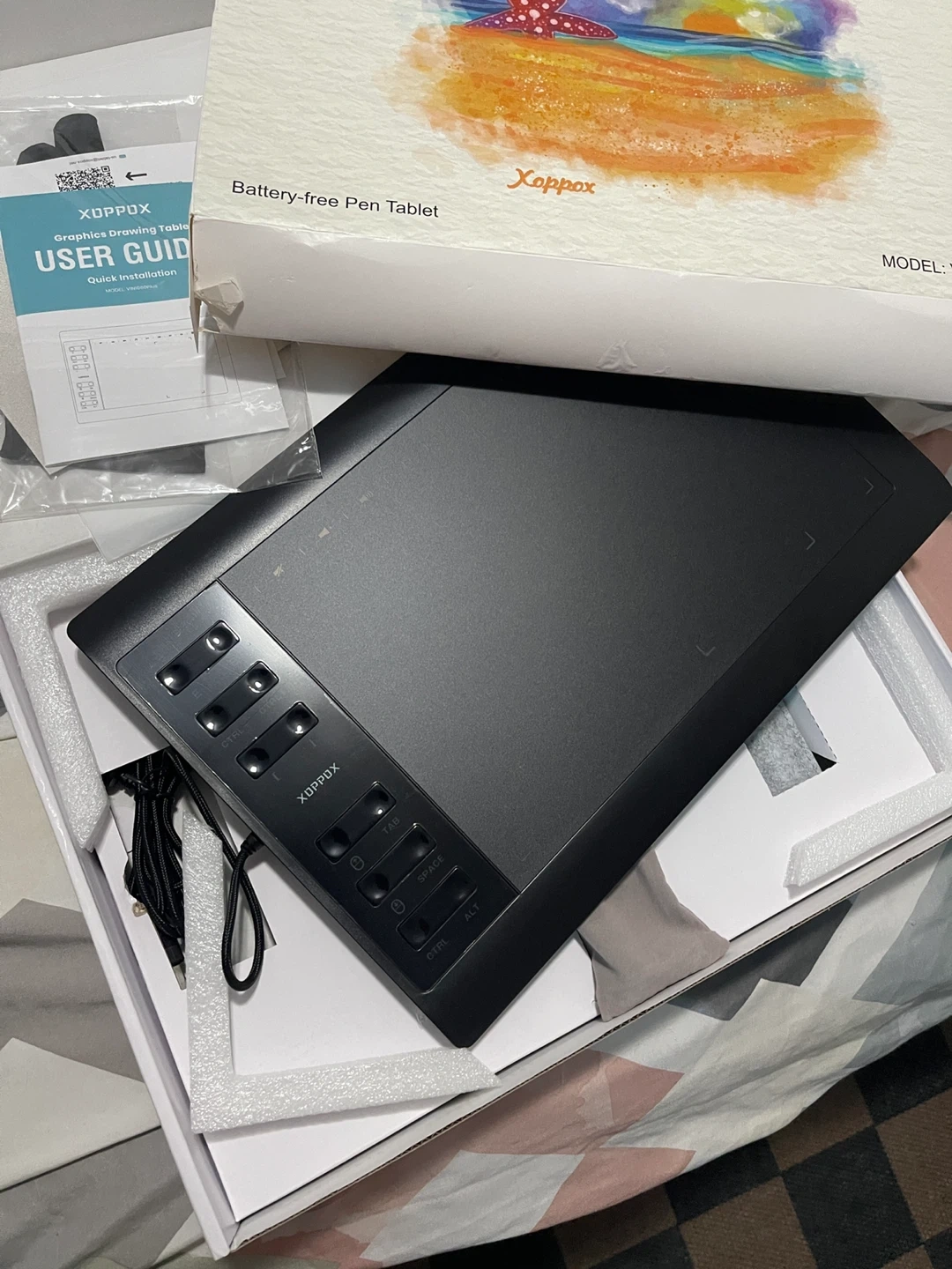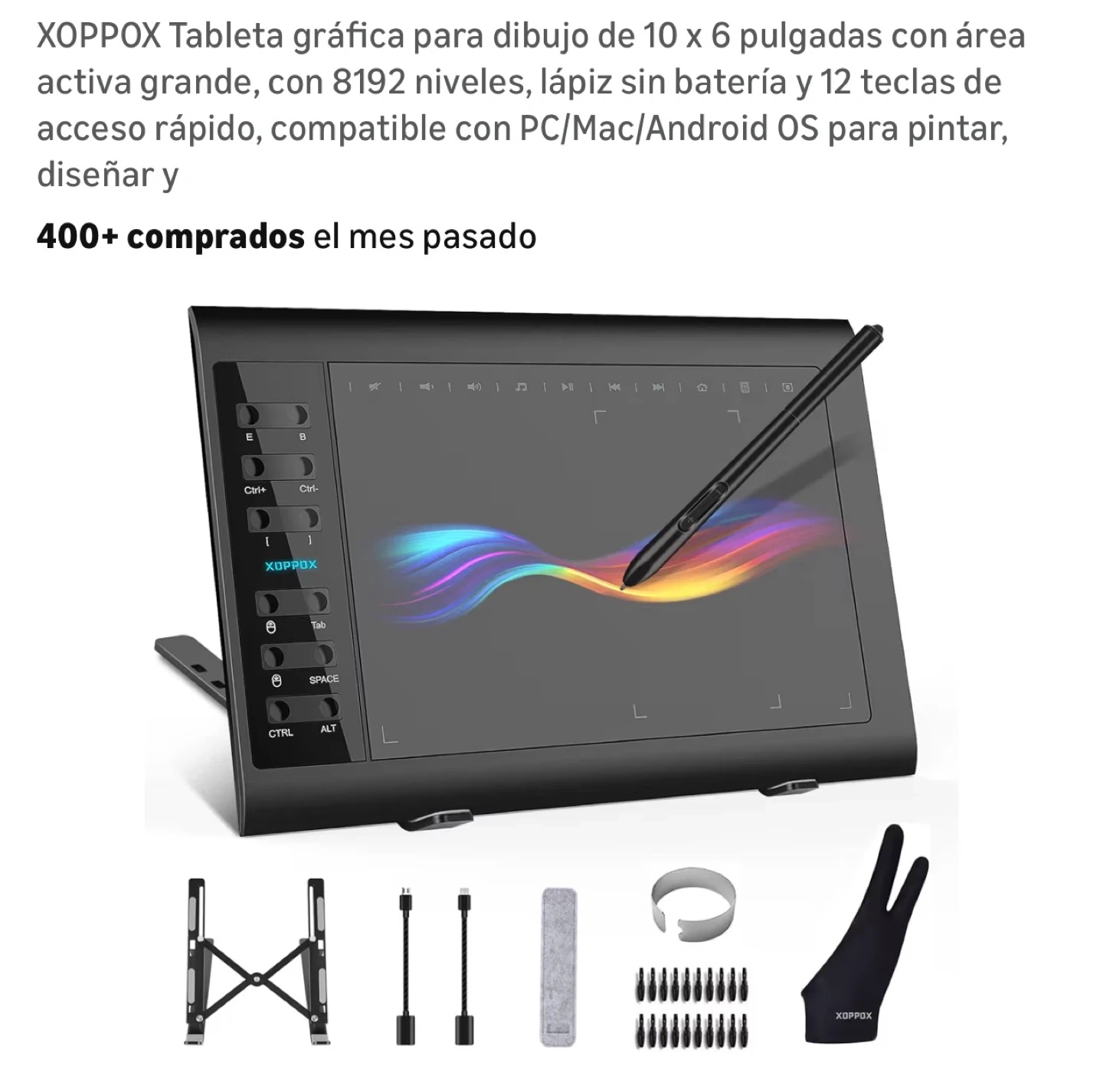 This Xoppox battery-free pen tablet has a 10 x 6 inch active area with 8192 levels of pressure sensitivity. It's compatible with Windows XP/7/8/10/11, Mac OS 10.7.0 and above, and Android 4.4+. It comes with a pen, stand, cables, and replacement nibs.