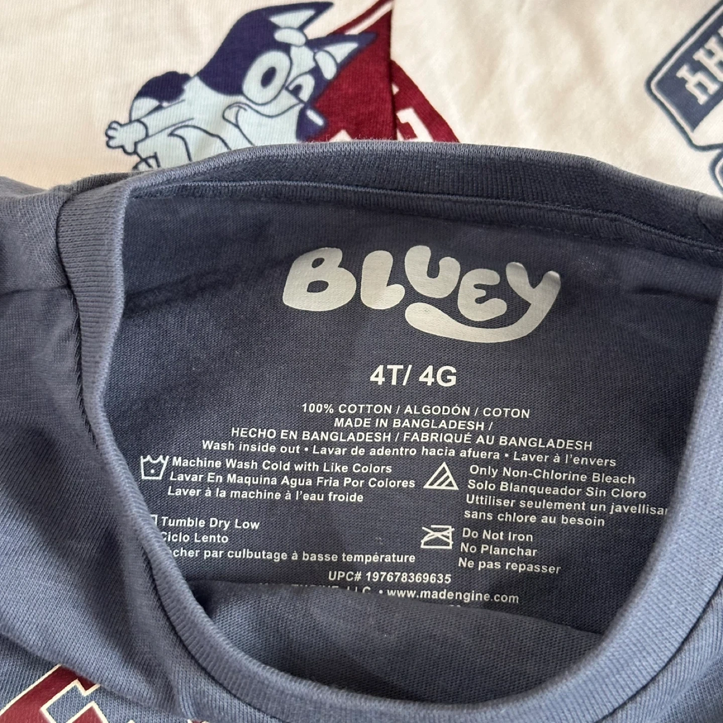 Two Bluey t-shirts for kids. Both are size 4T. The blue shirt has "Let's Play Bluey" graphics. The white shirt has "Bluey" lettering and graphics. 100% cotton fabric. Machine wash cold with like colors.