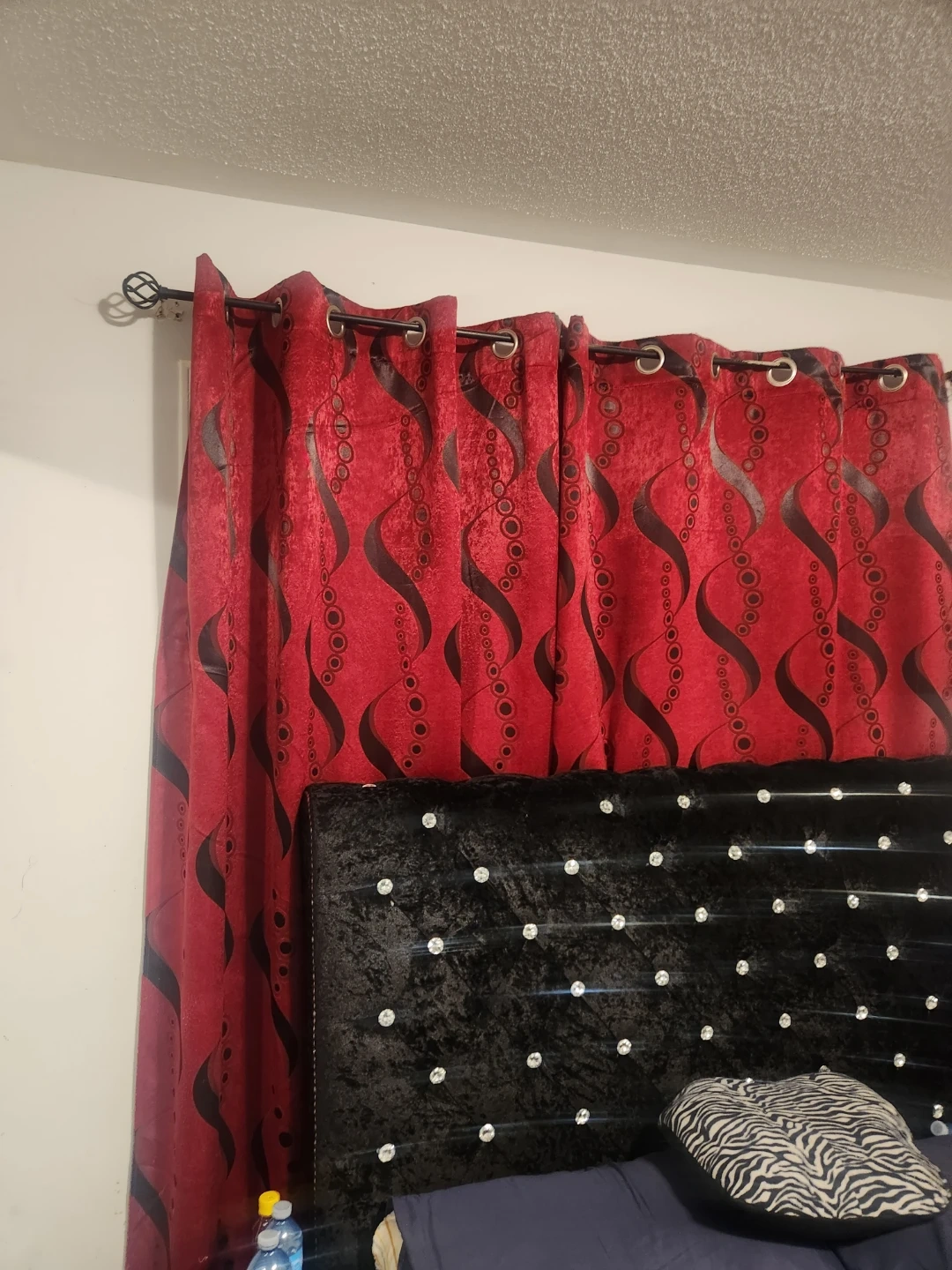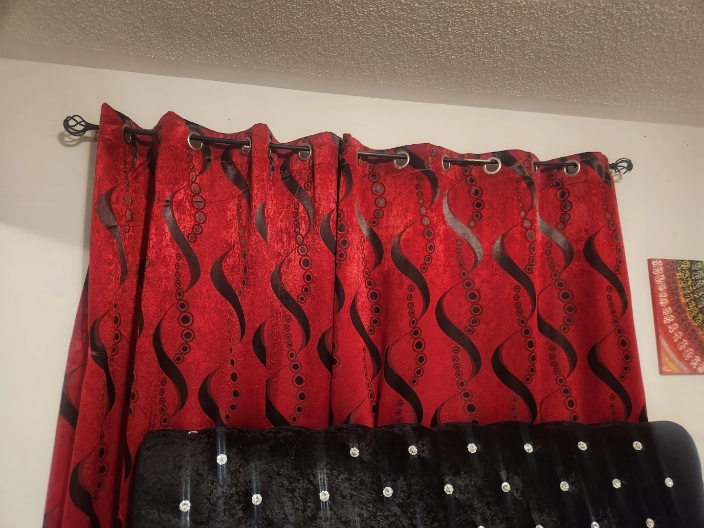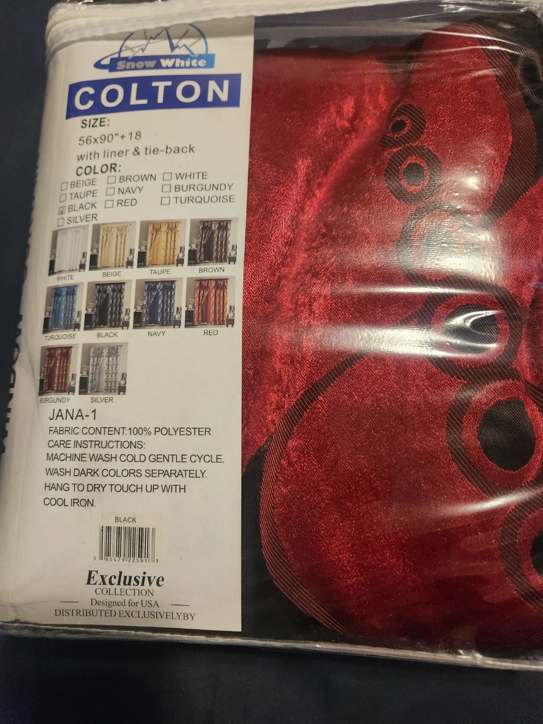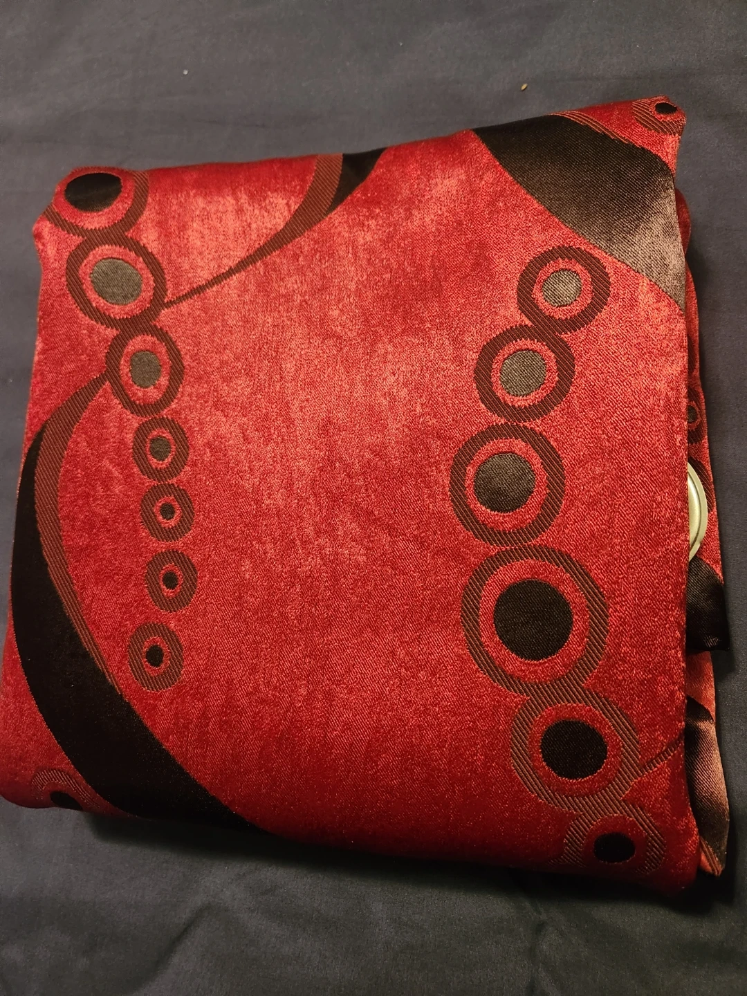 These curtains feature a bold red and black abstract design with circular motifs. They're made from a satin-like material that reflects light. The curtains come with grommets for easy hanging.