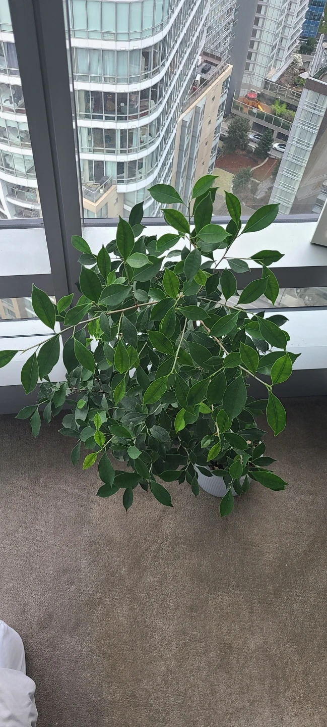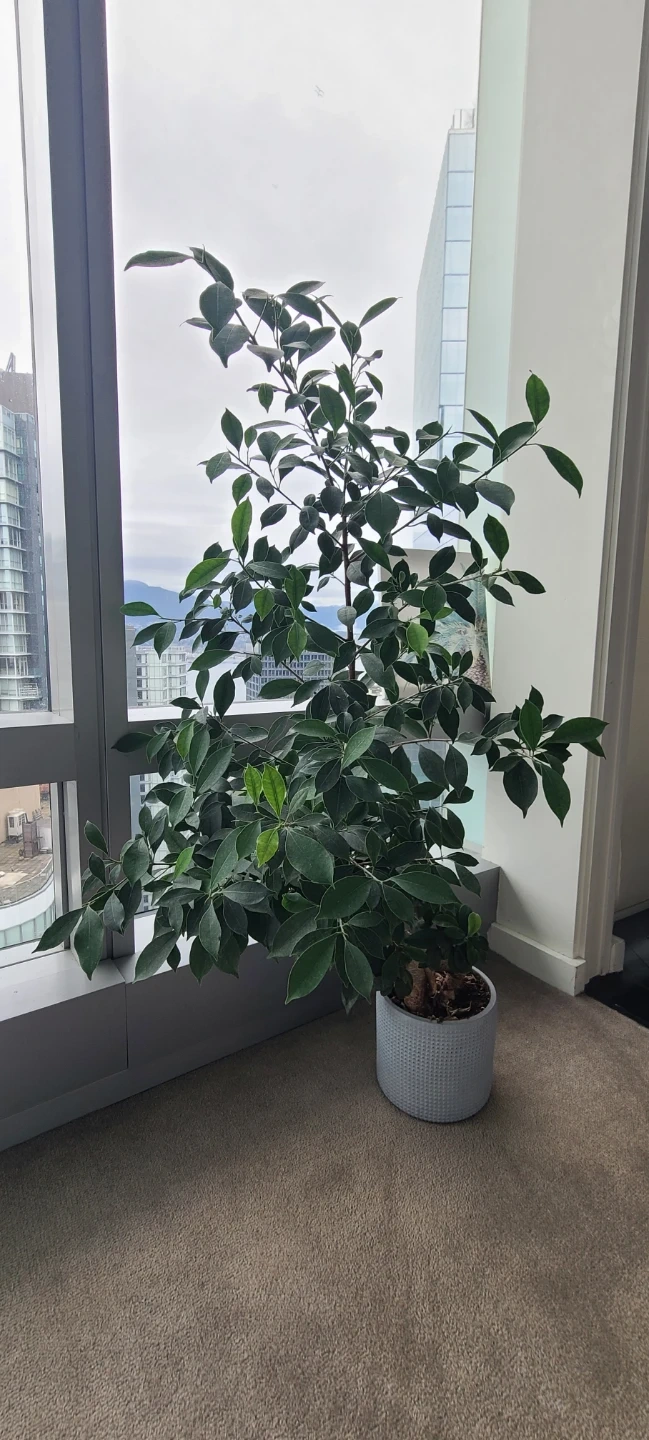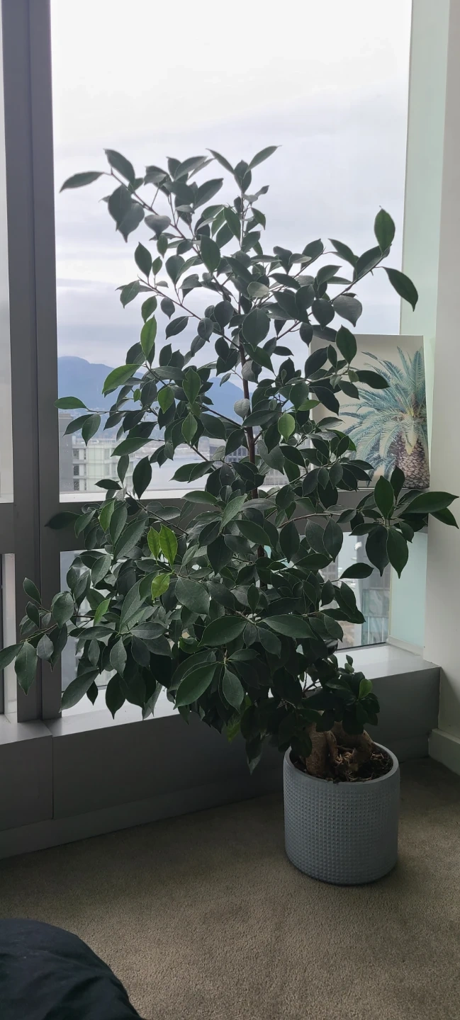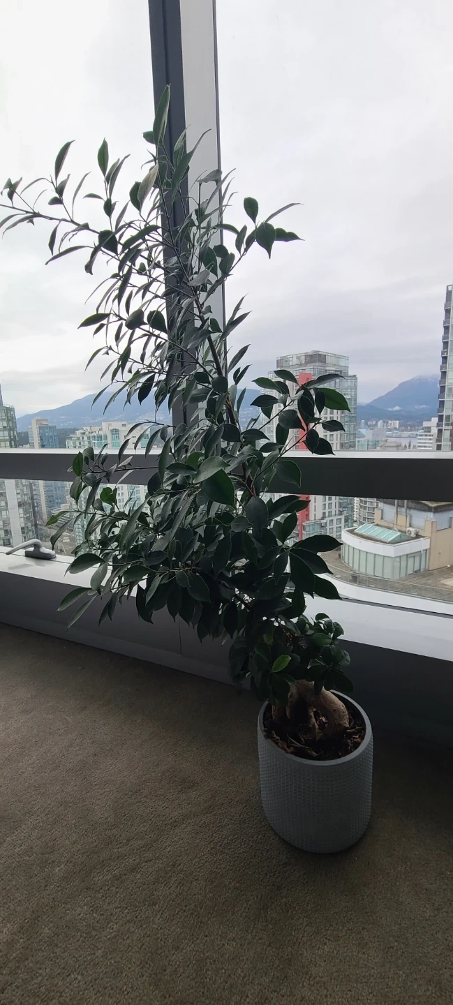 A lovely bonsai tree comes in a textured grey pot. It's a beautiful indoor plant with dark green leaves. This tree would be a great addition to any living space! 7 year old tree, strong and healthy, loves some sun but not too much, moderate watering once a week