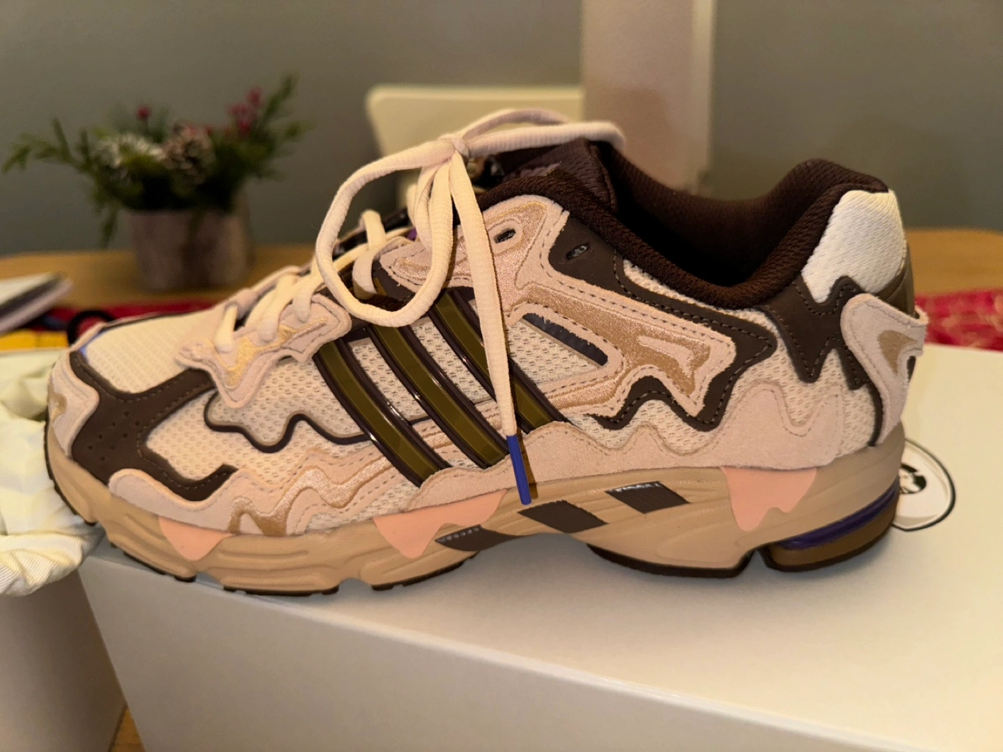 Adidas sneakers. Brown and beige colorway. Suede and mesh upper. Chunky sole. Lace-up closure.