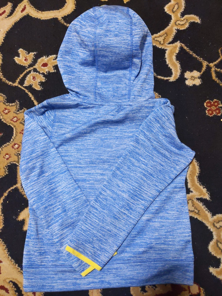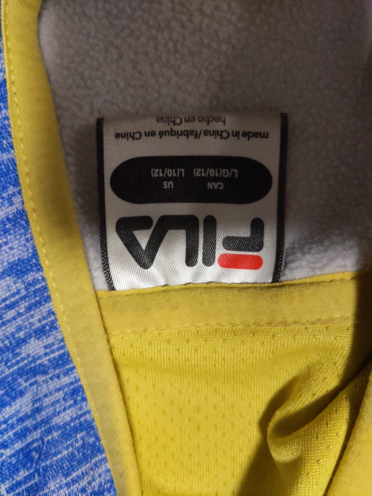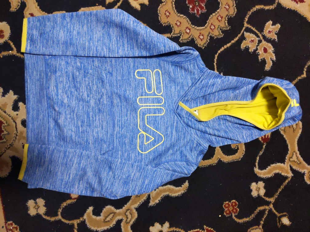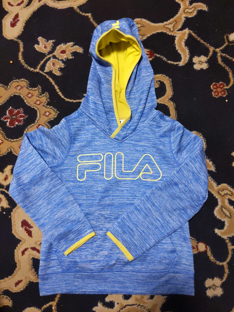 Blue and yellow hoodie. Long sleeves. Has a hood. The brand is Fila and the condition is like new. It is very soft and warm for cold weather, fall or spring. It is unisex. Size is 10-12. It has a big pocket at the front. Payment is cash only and pickup only please buy!