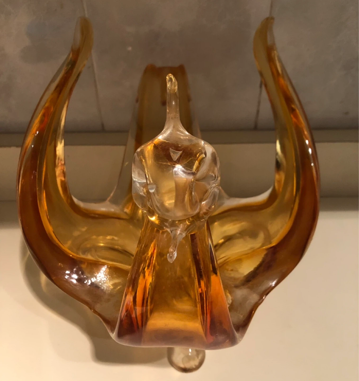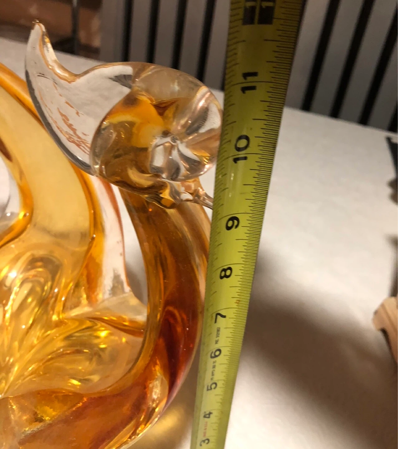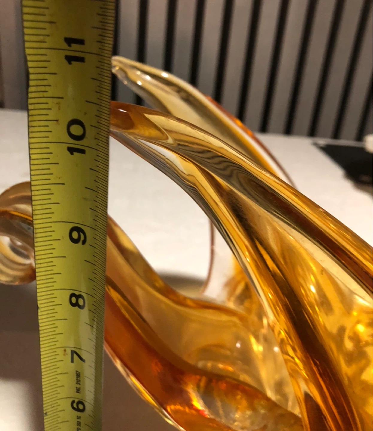 Beautiful amber coloured glass bowl shaped like a swan. It's approximately 9 inches tall at its highest point. Glass material.