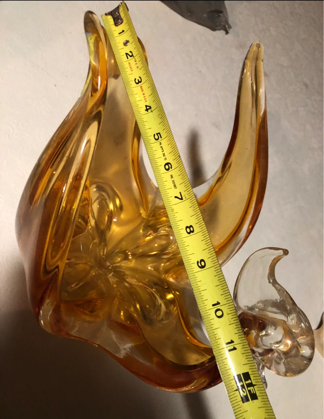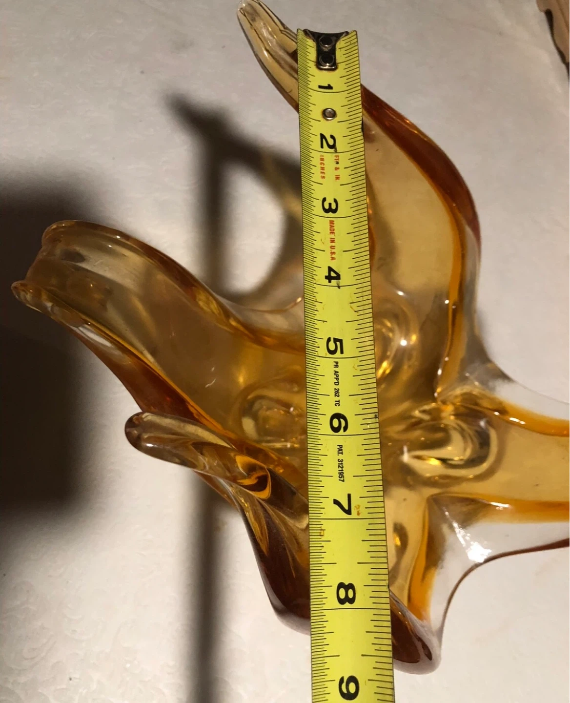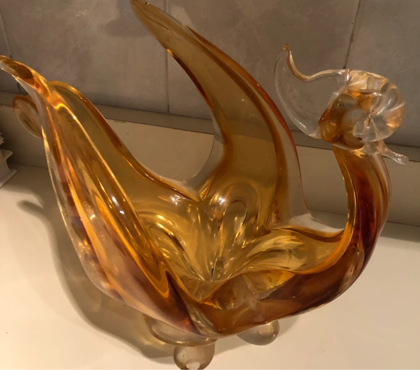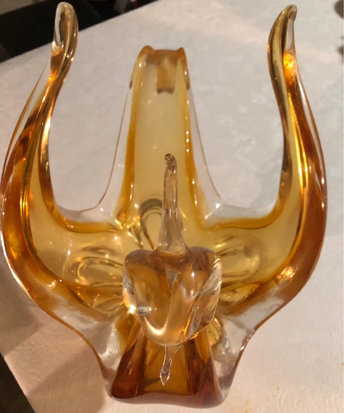 Beautiful amber coloured glass bowl shaped like a swan. It's approximately 9 inches tall at its highest point. Glass material.