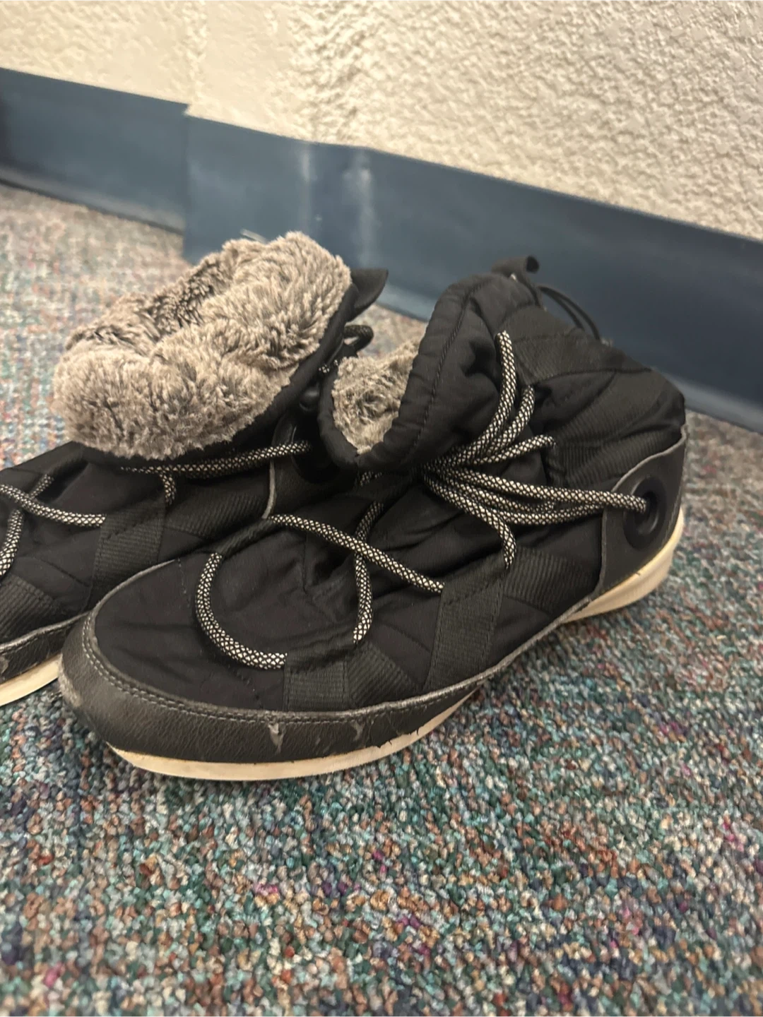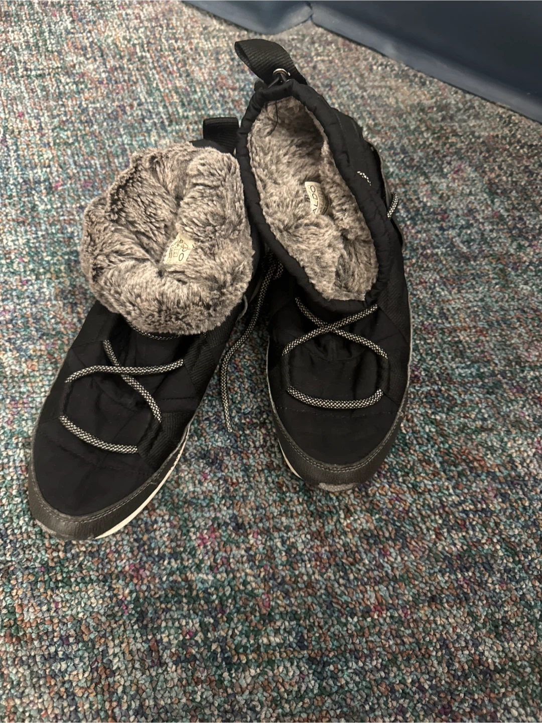 Cozy black puffer boots with warm faux fur lining. These winter boots feature a cinch cord for a snug fit. They're perfect for keeping your feet toasty on cold days!