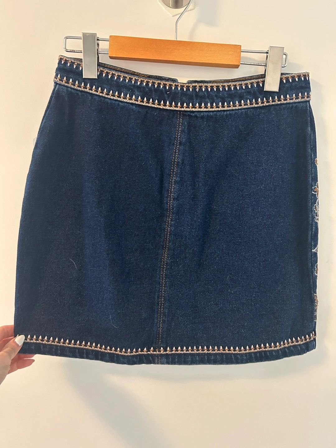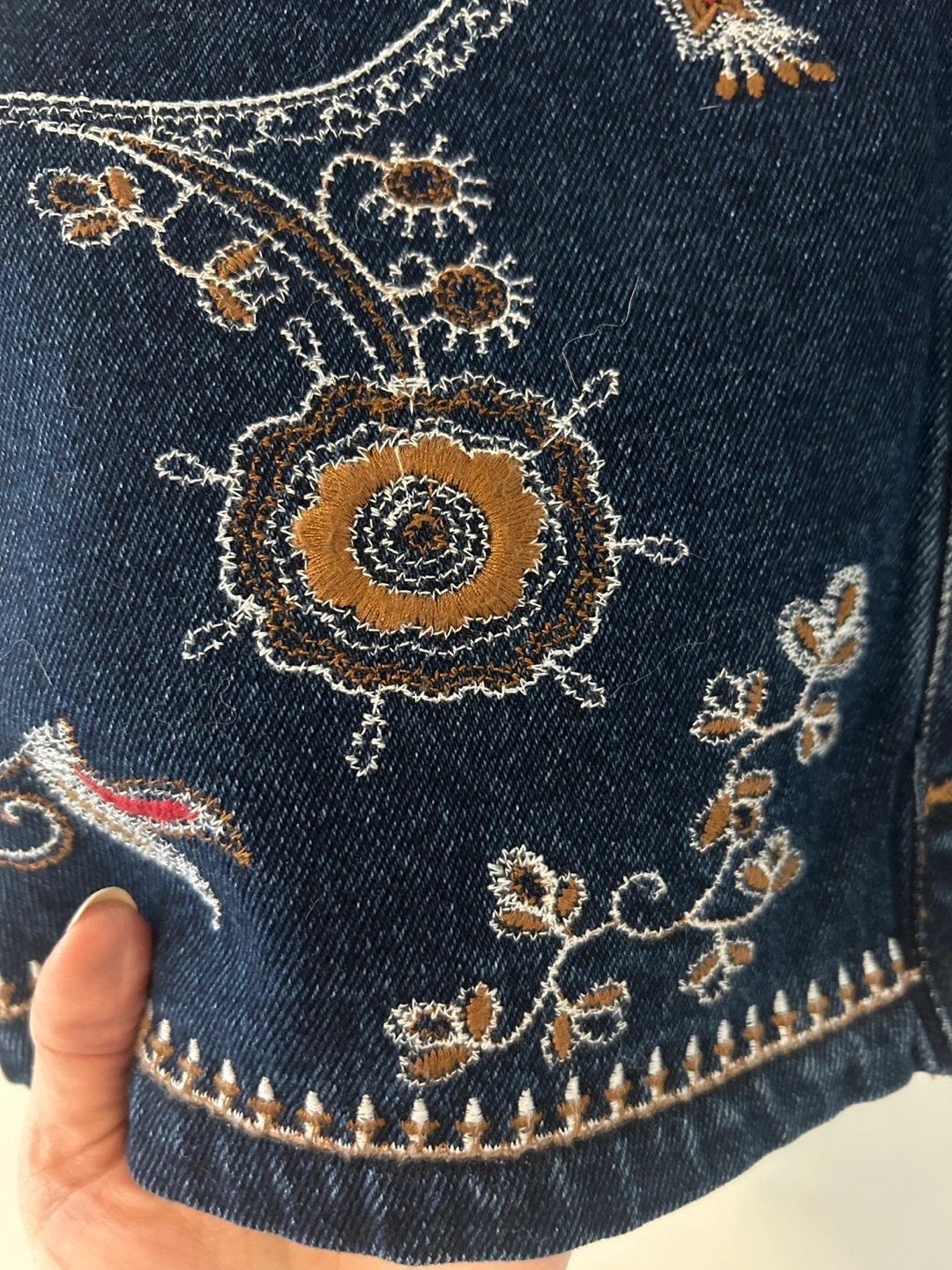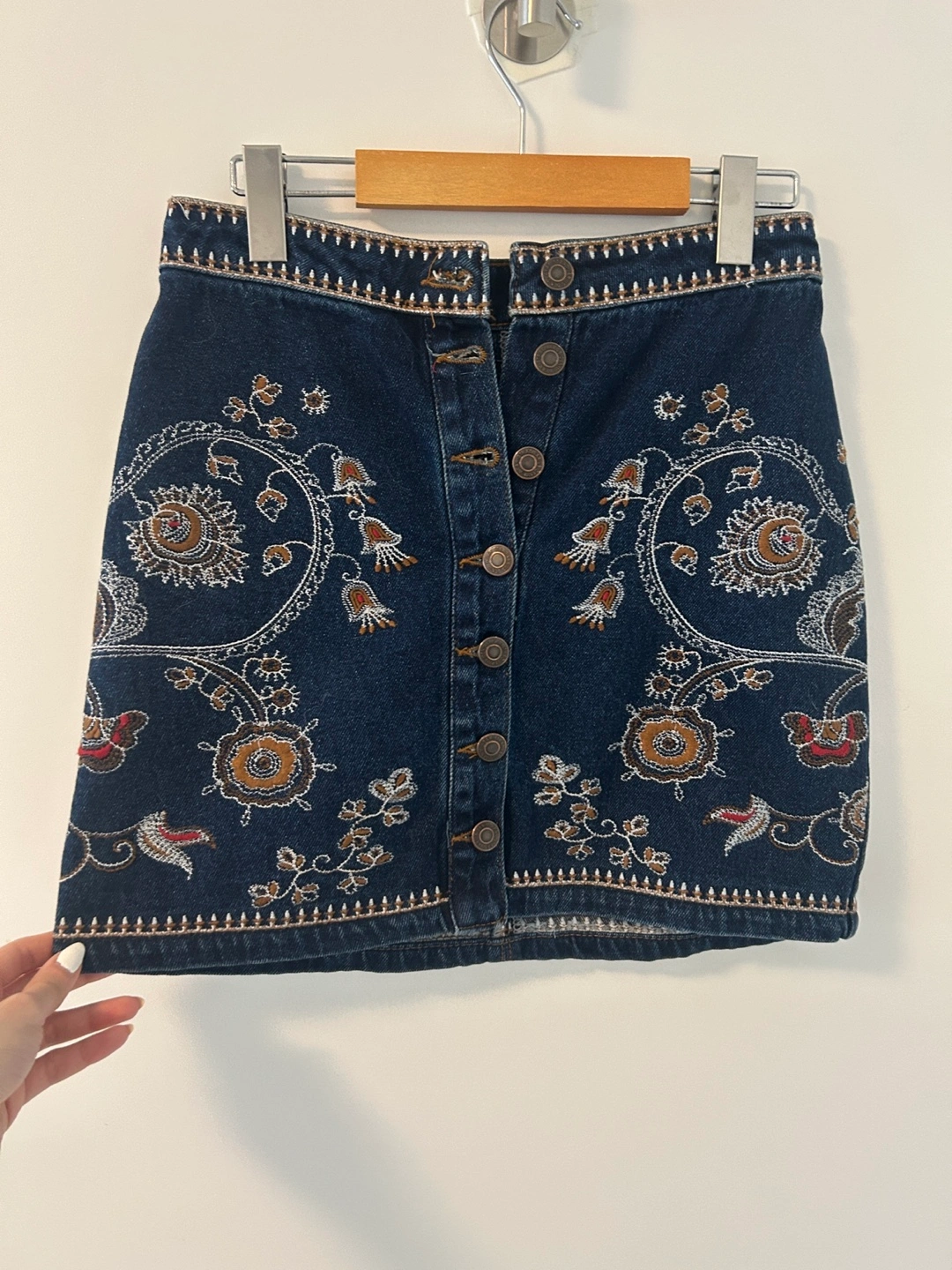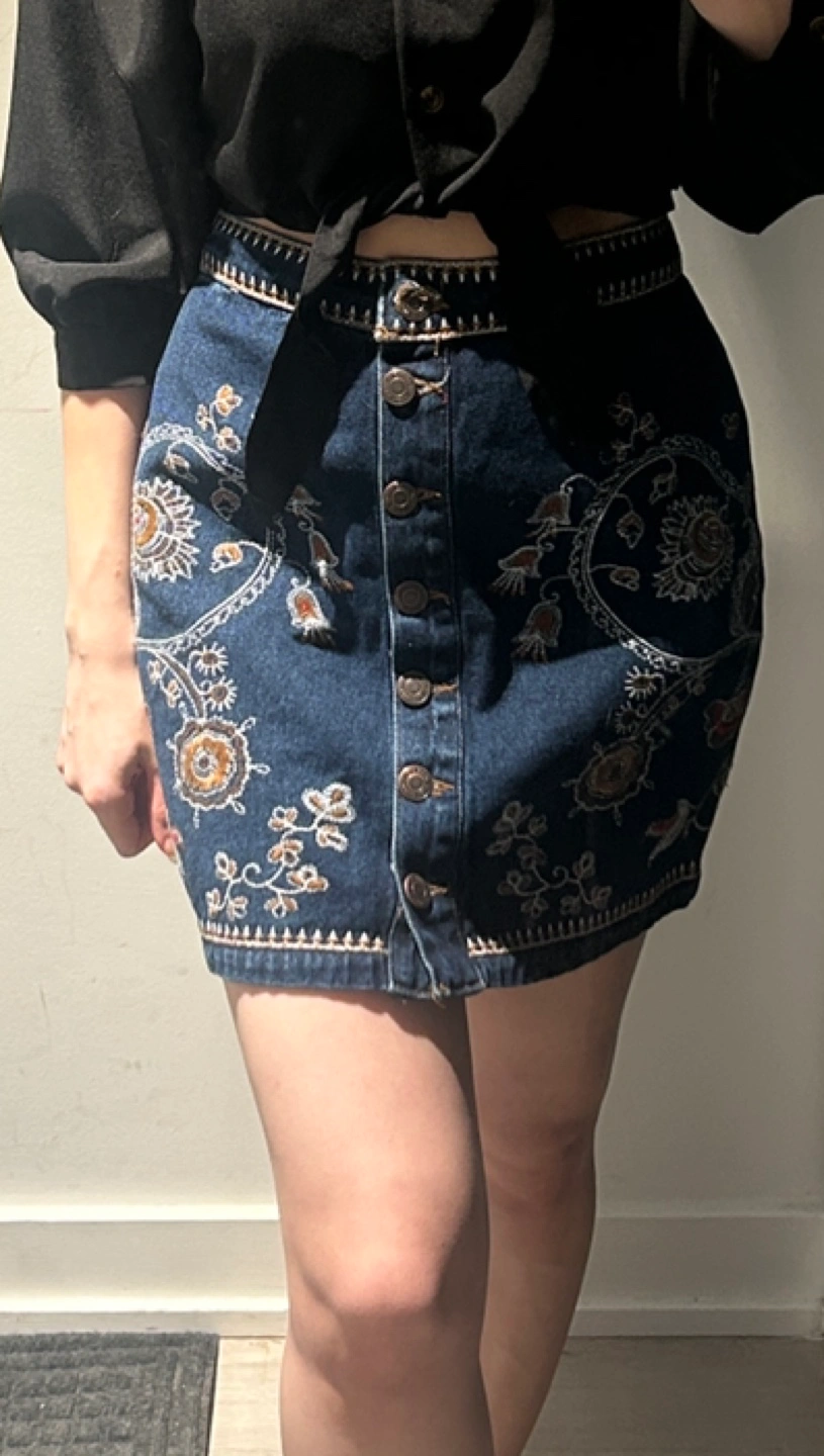 Dark wash denim mini skirt. Features intricate embroidery and button front closure. Unique and stylish.