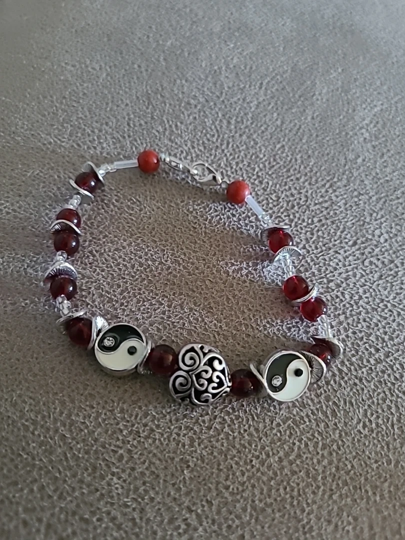 This is a cute bracelet with red beads and silver accents. It features yin yang symbols and a decorative heart charm. It's in great condition and would be a lovely addition to any jewelry collection