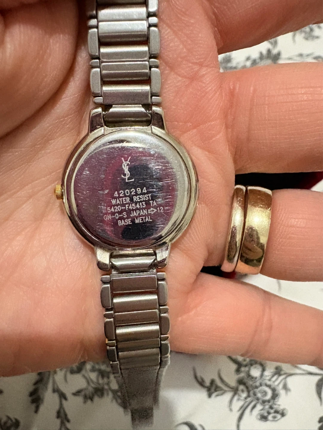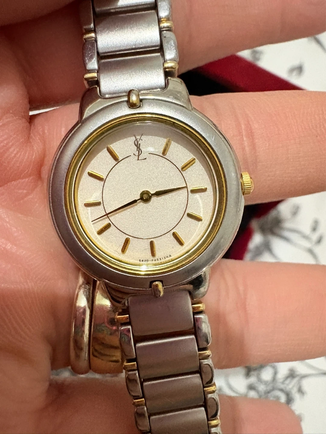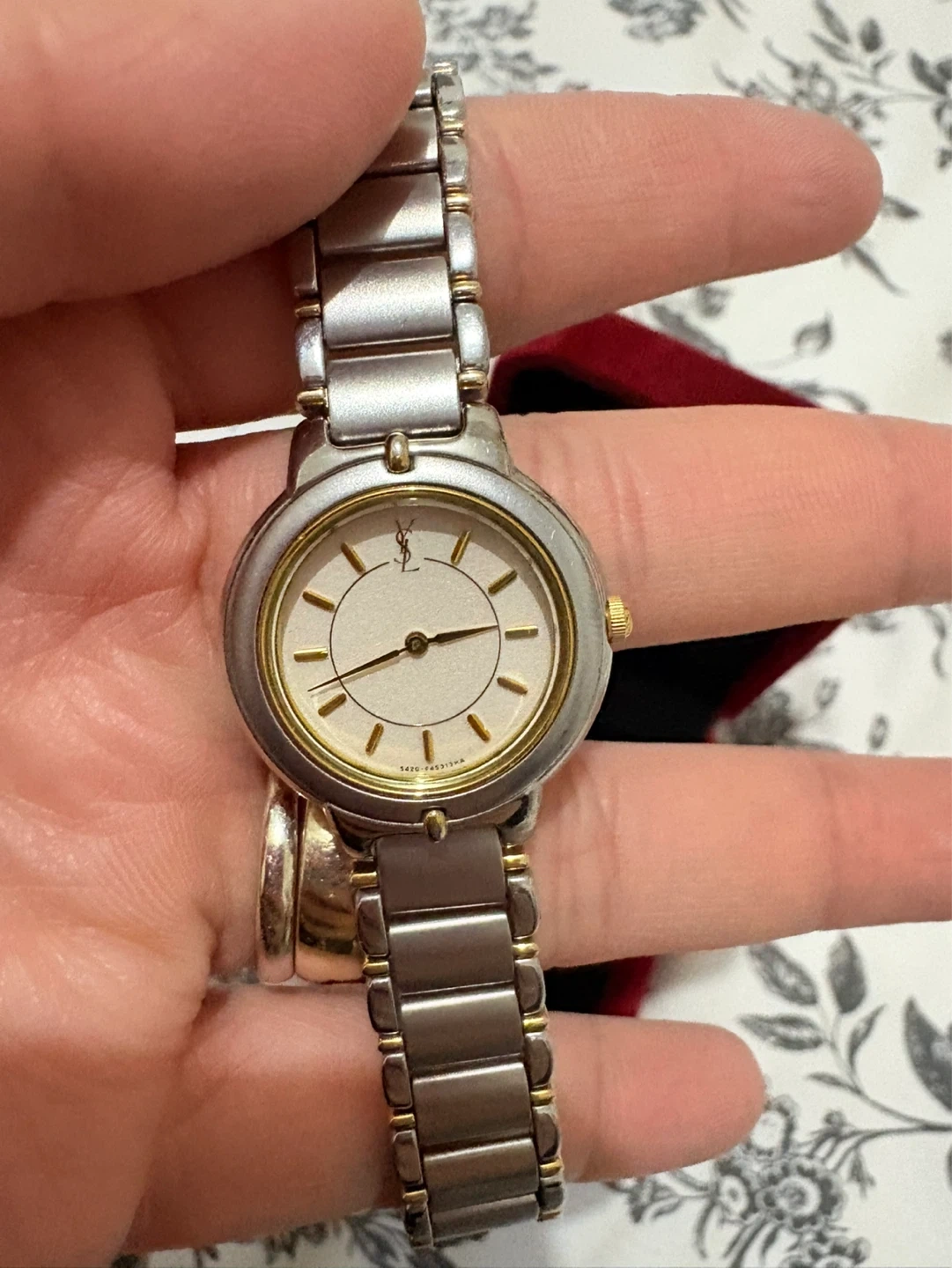 Classic Yves Saint Laurent watch with a silver-tone metal band and gold-tone accents. Base metal case.