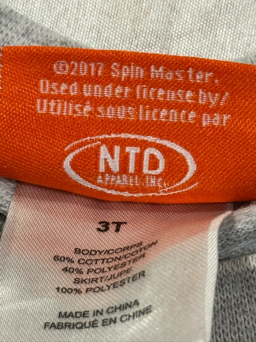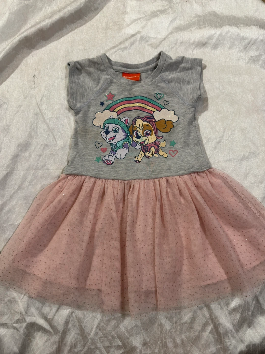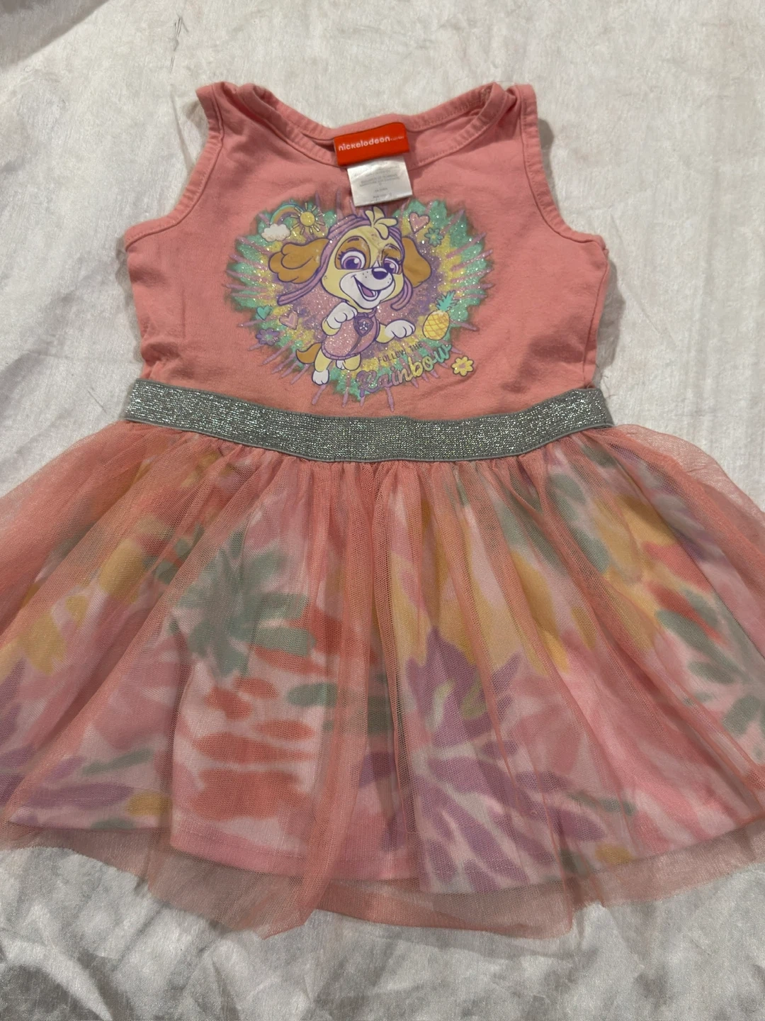 This is a bundle of three girls' dresses in size 3T. Includes a navy blue floral dress and two Paw Patrol themed dresses. One dress has a tiered skirt with tropical bird and pineapple print. The other Paw Patrol dress is pink with a tulle skirt. The remaining dress is white with colourful stripes. $5 each