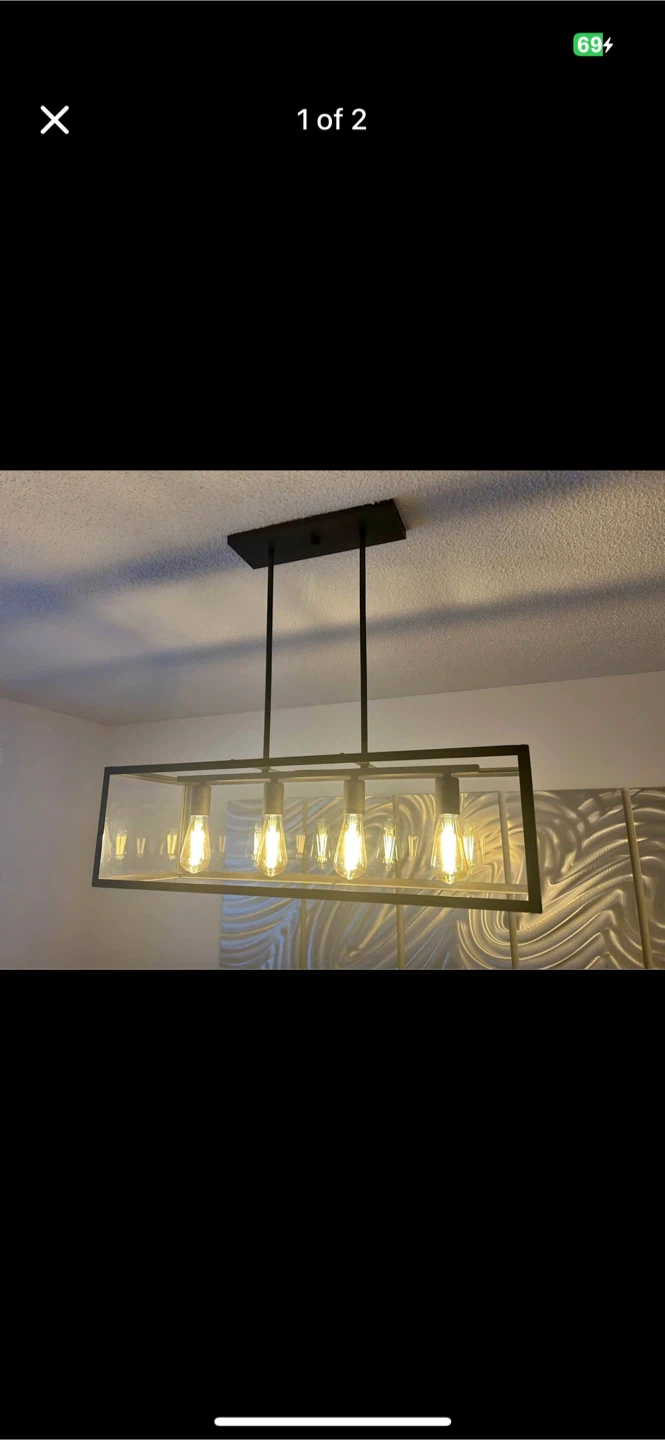 Selling a modern rectangular chandelier! It features a sleek, minimalist design with a dark frame and multiple bulbs. It would be a great addition to any dining room or living space