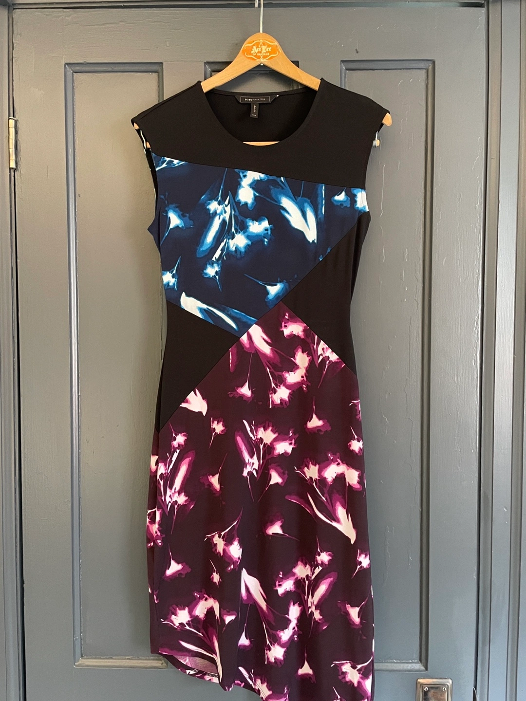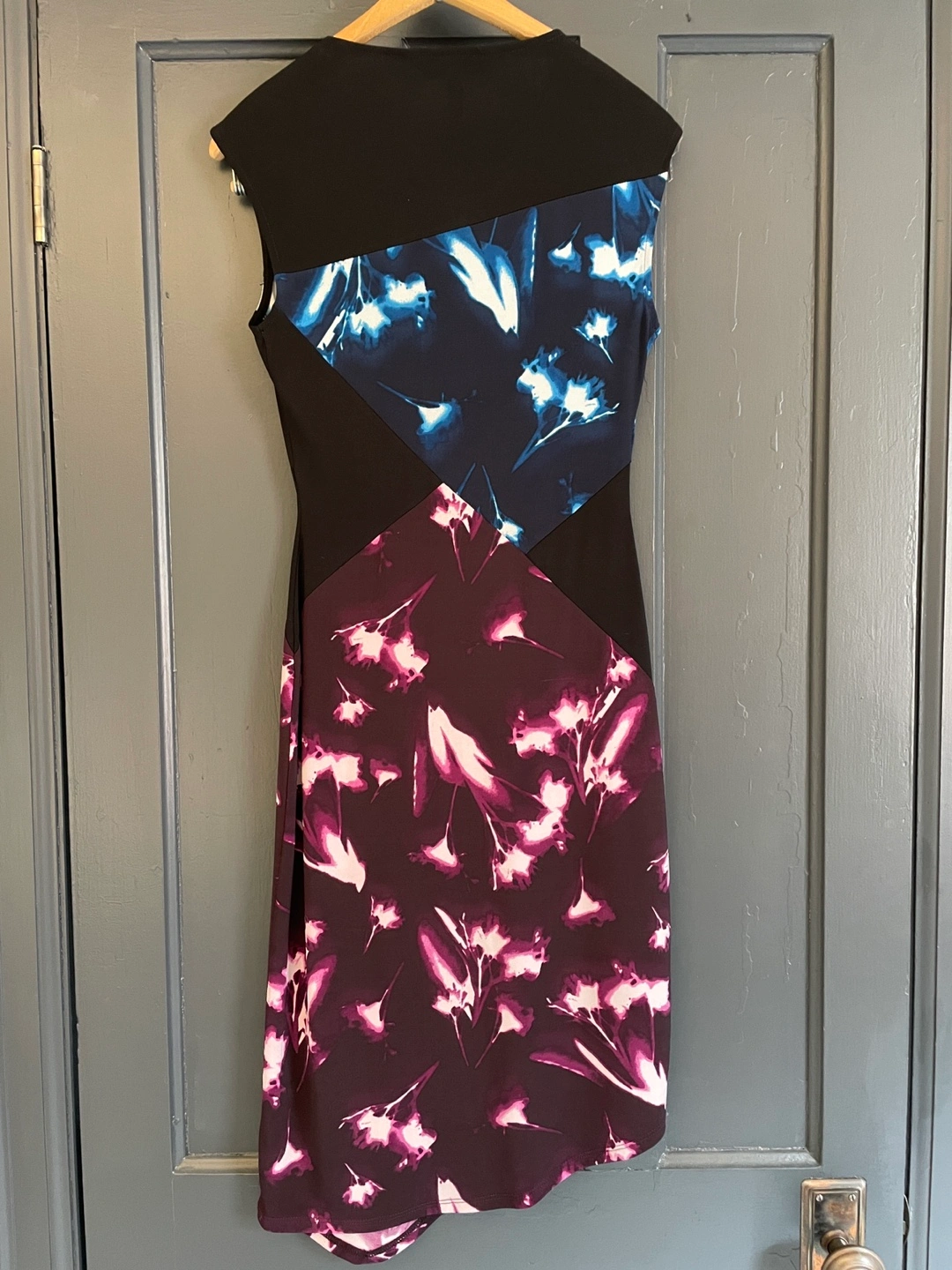 Sleeveless dress. Asymmetrical hemline. Colour blocked black, purple, and blue. Fabric stretches, very comfortable. Excellent condition.