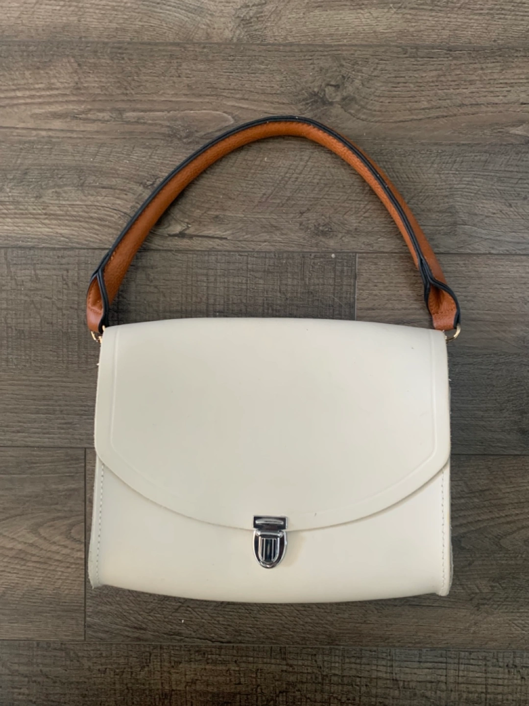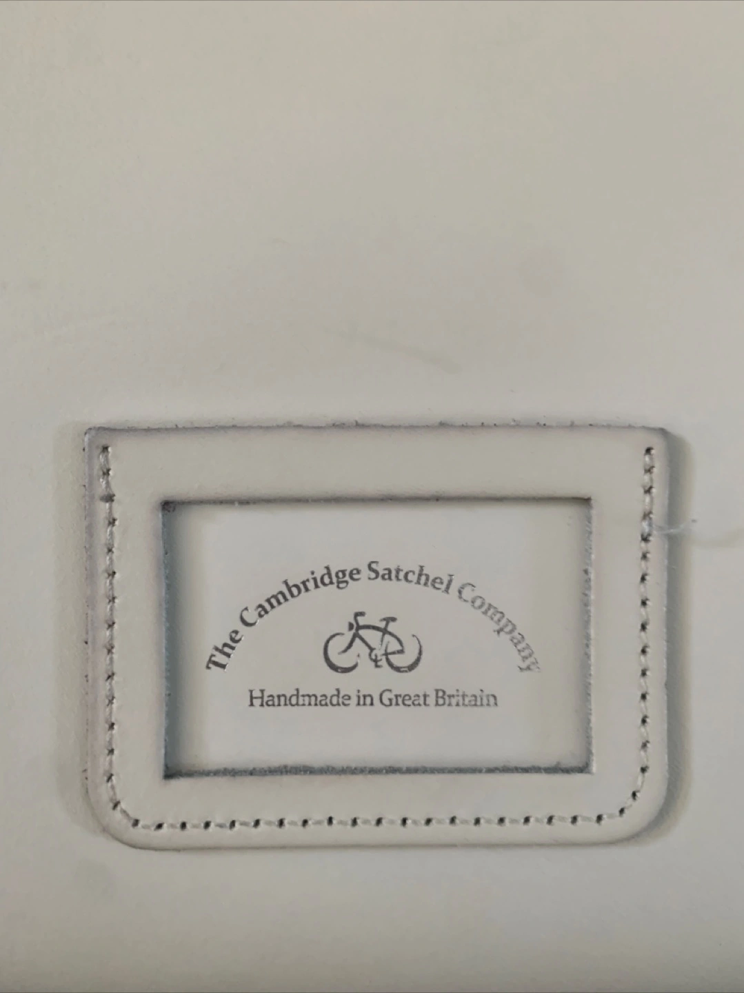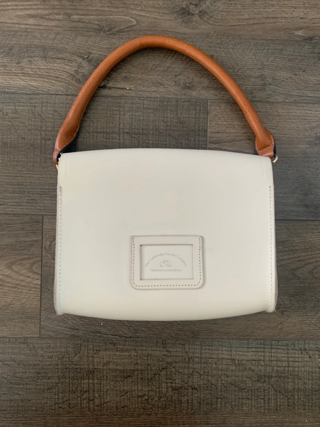 Here's a lovely handbag from The Cambridge Satchel Company! It's a cream colour with a brown handle and a silver clasp. Handmade in Great Britain.