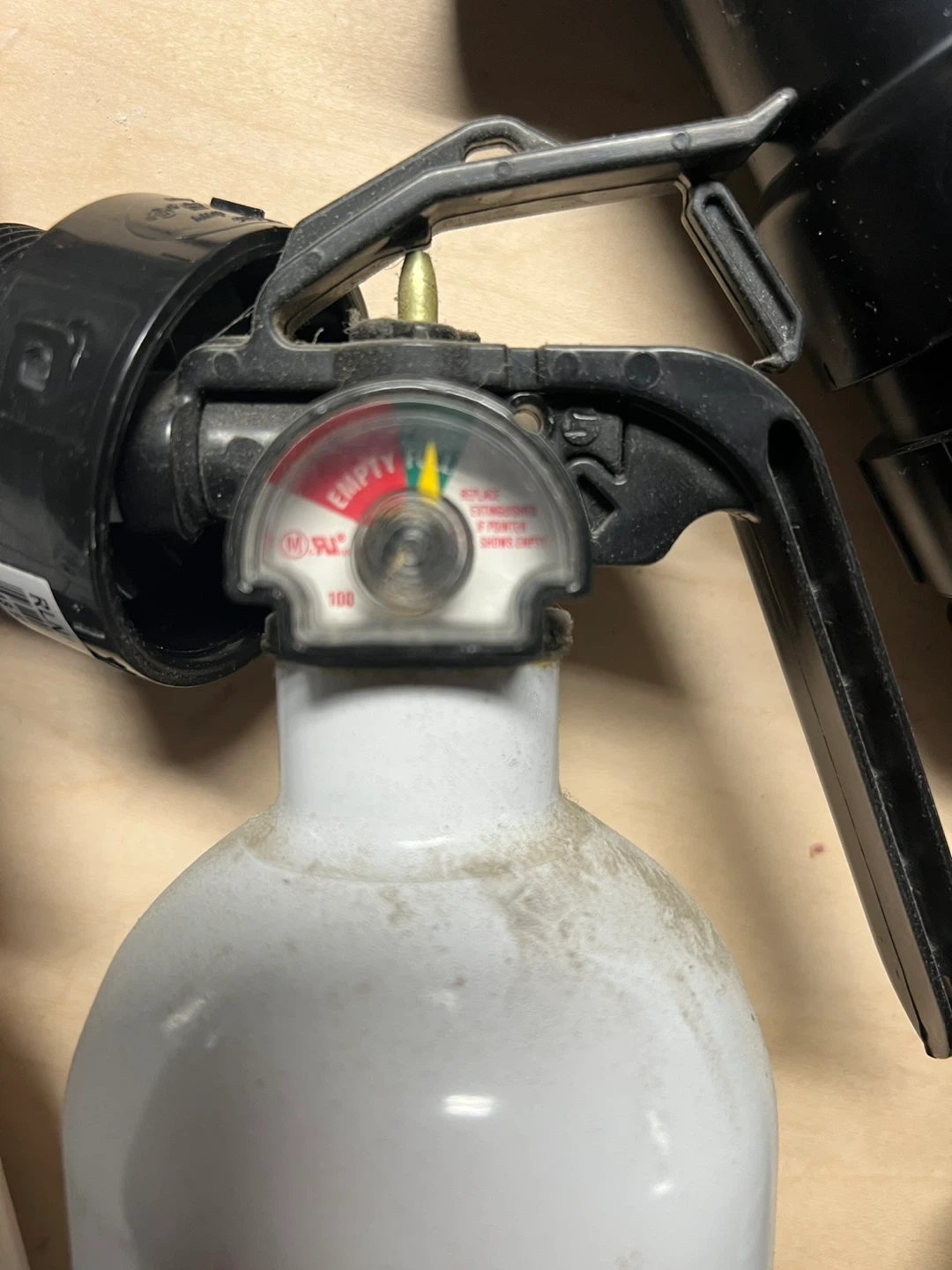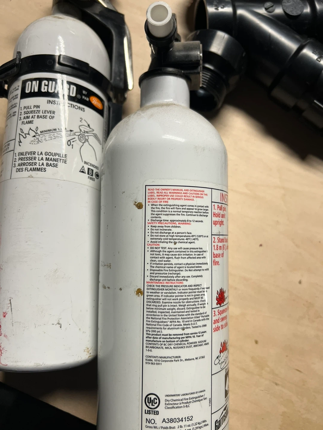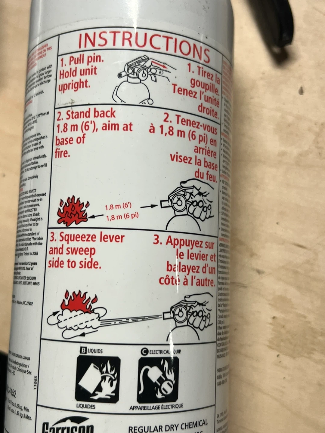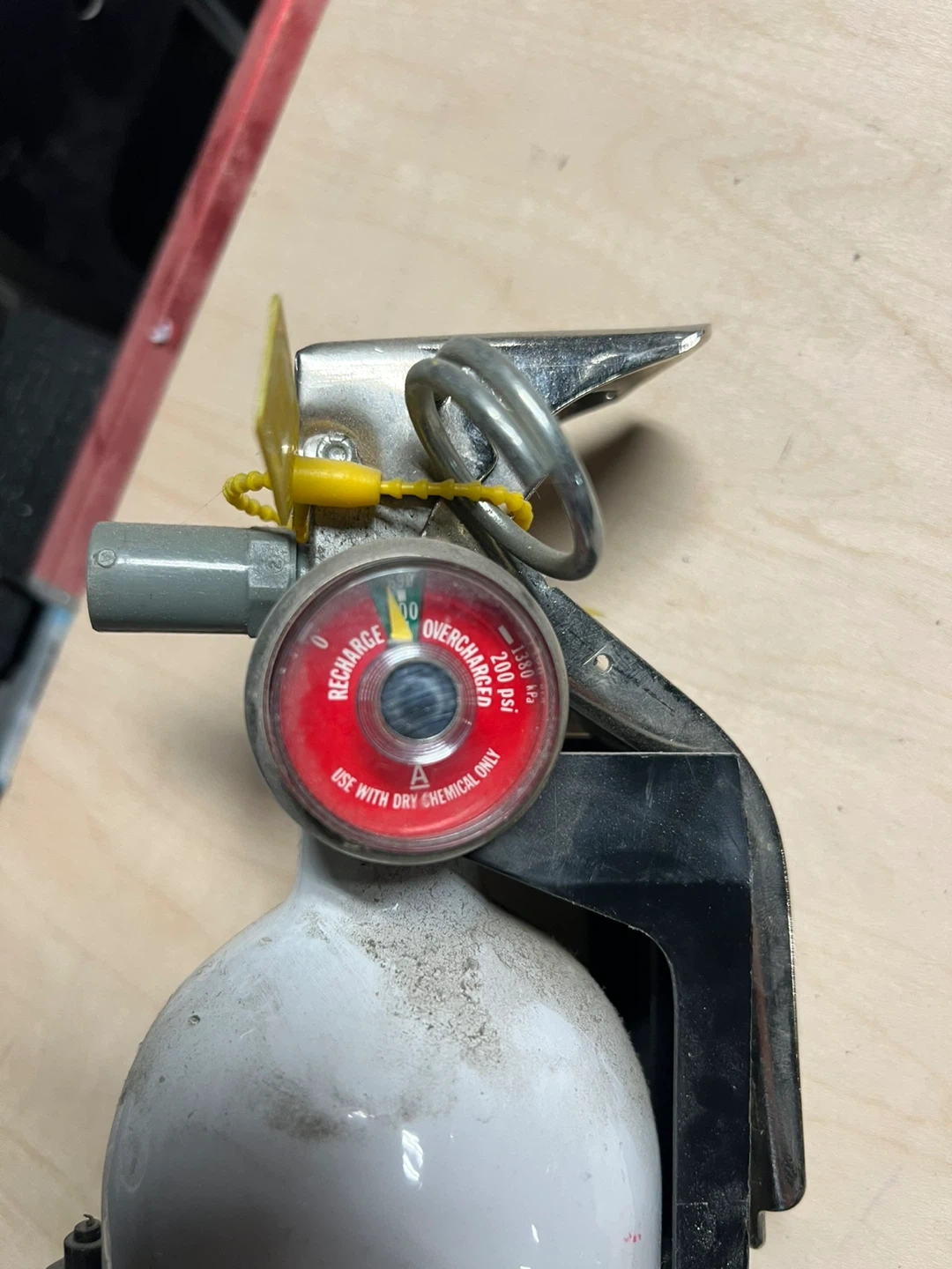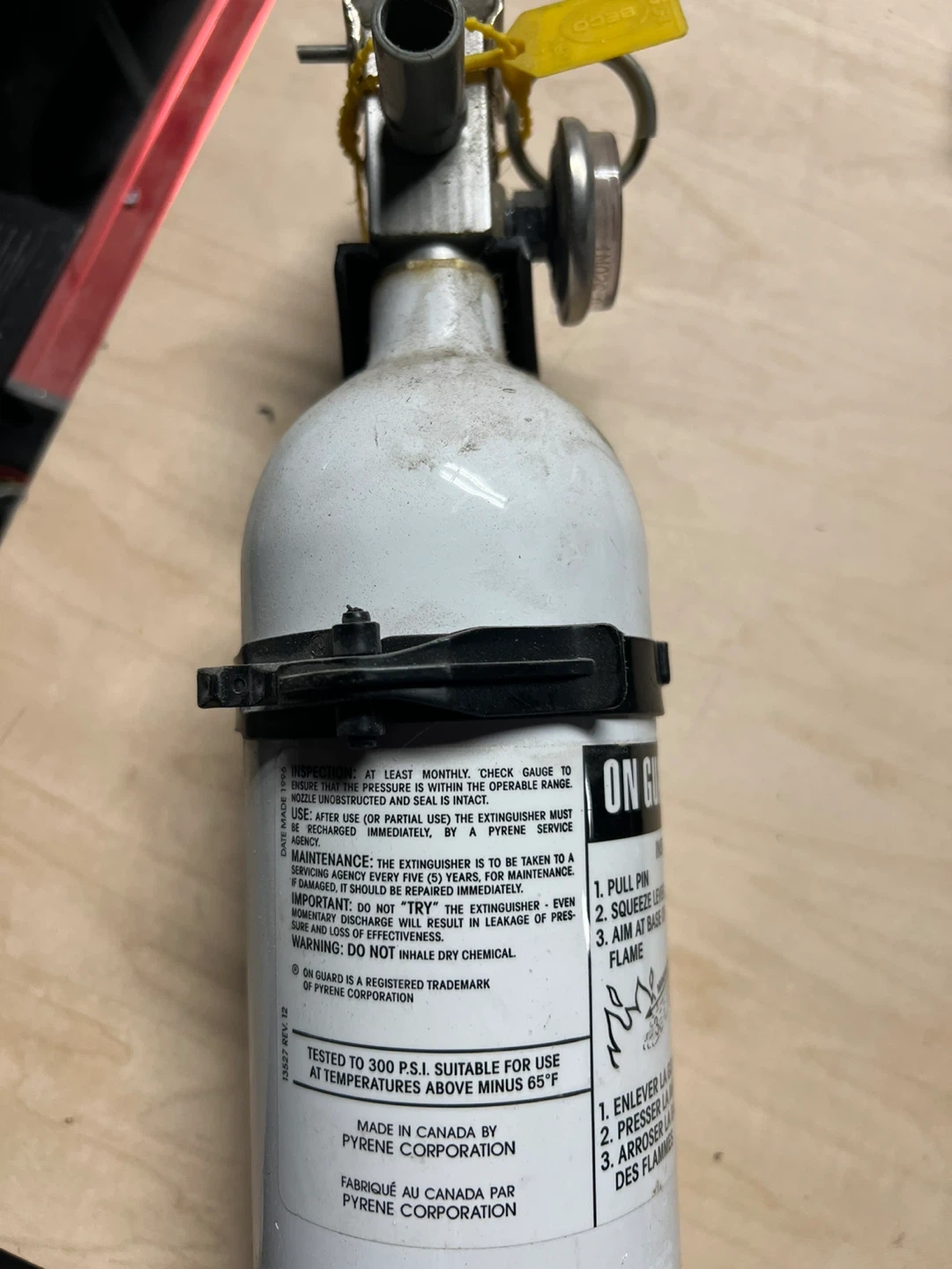 This is a Pyrene Corporation dry chemical fire extinguisher, made in Canada. It's tested to 300 P.S.I. for use at temperatures above -65°F. Suitable for ABC type fires.