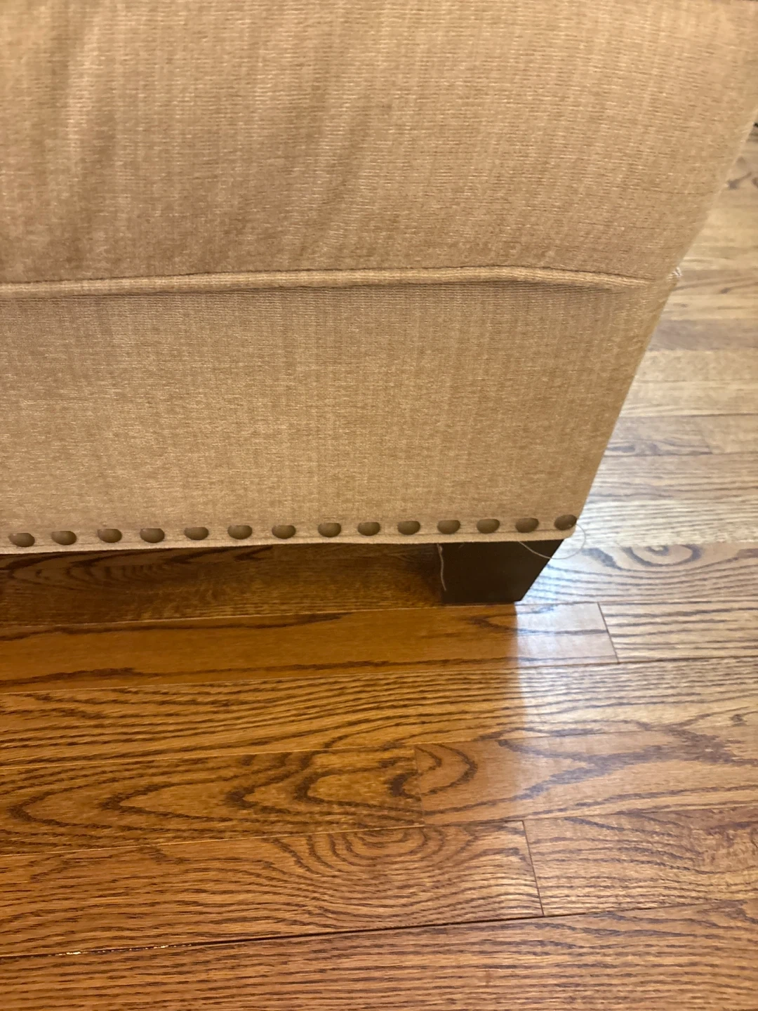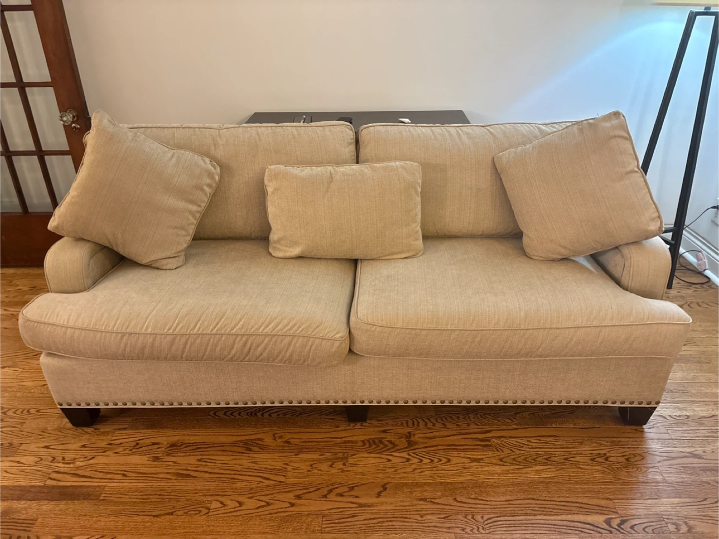 Comfortable three-seater sofa in a neutral beige fabric. It comes with four accent pillows for added comfort and style. Decorative nailhead trim lines the base.