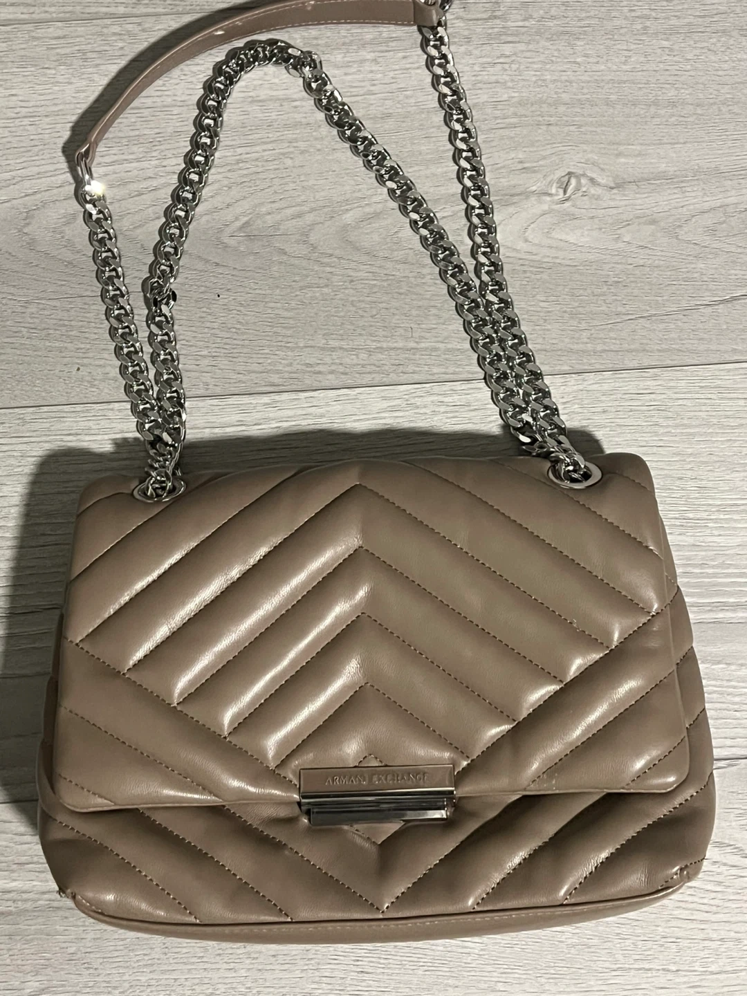 This is an Armani Exchange quilted shoulder bag with a chain strap. It has a taupe colour and a chevron pattern. The bag features a metal clasp closure.