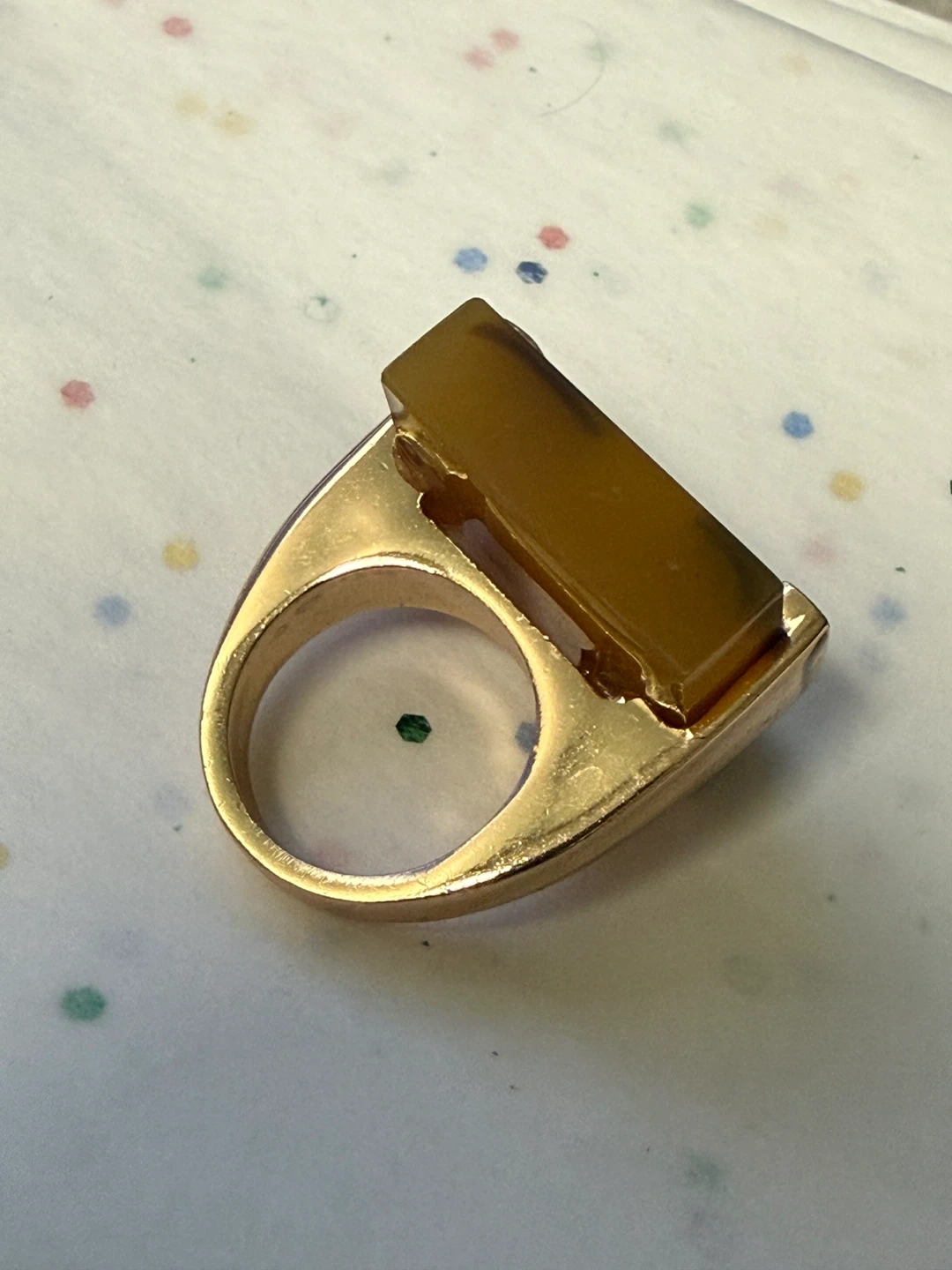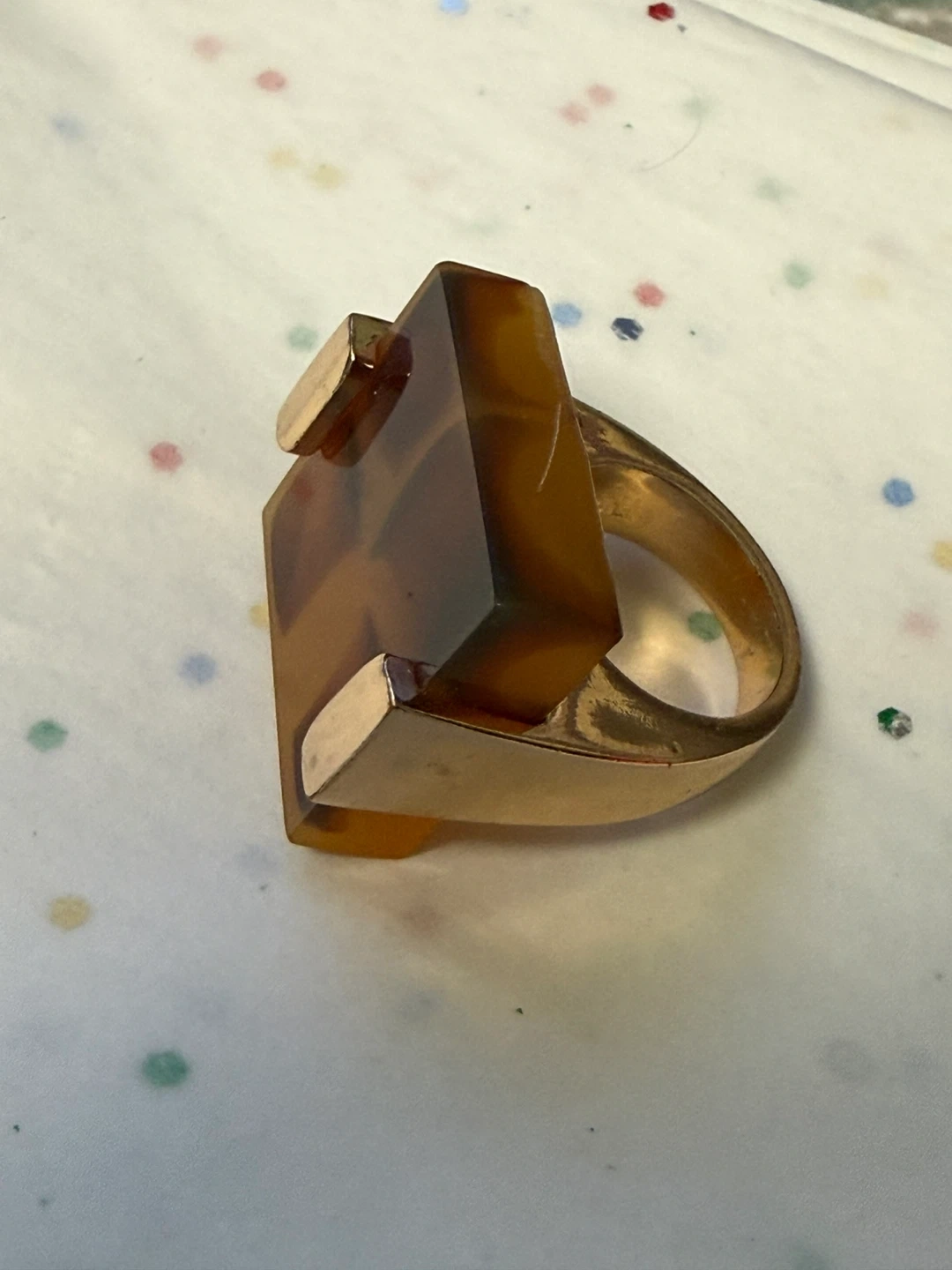 Unique statement ring with a brown, patterned stone and gold-tone band. It's in great condition and ready to add some flair to your outfit!
