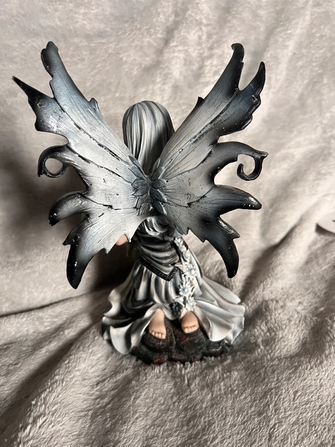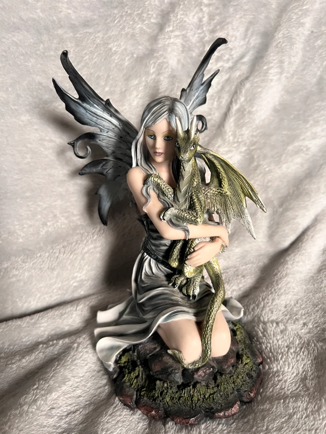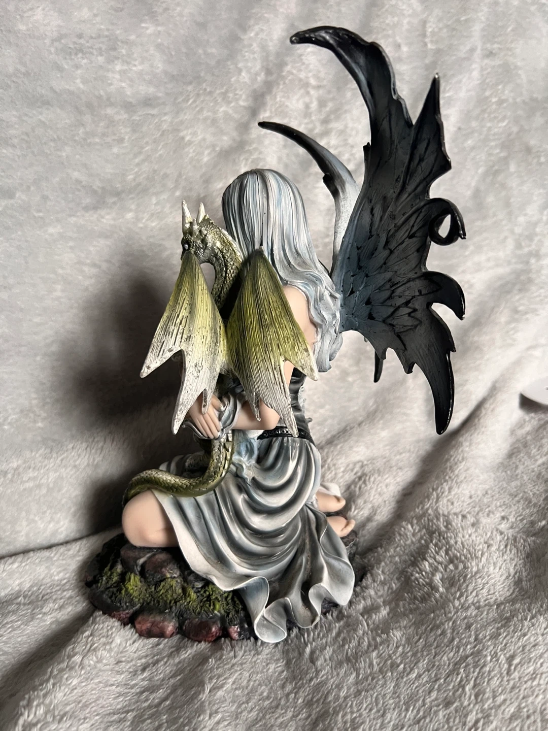 Detailed figurine of a fairy holding a dragon. It's made from resin and hand-painted with a matte finish. This piece would be a lovely addition to any fantasy collection.