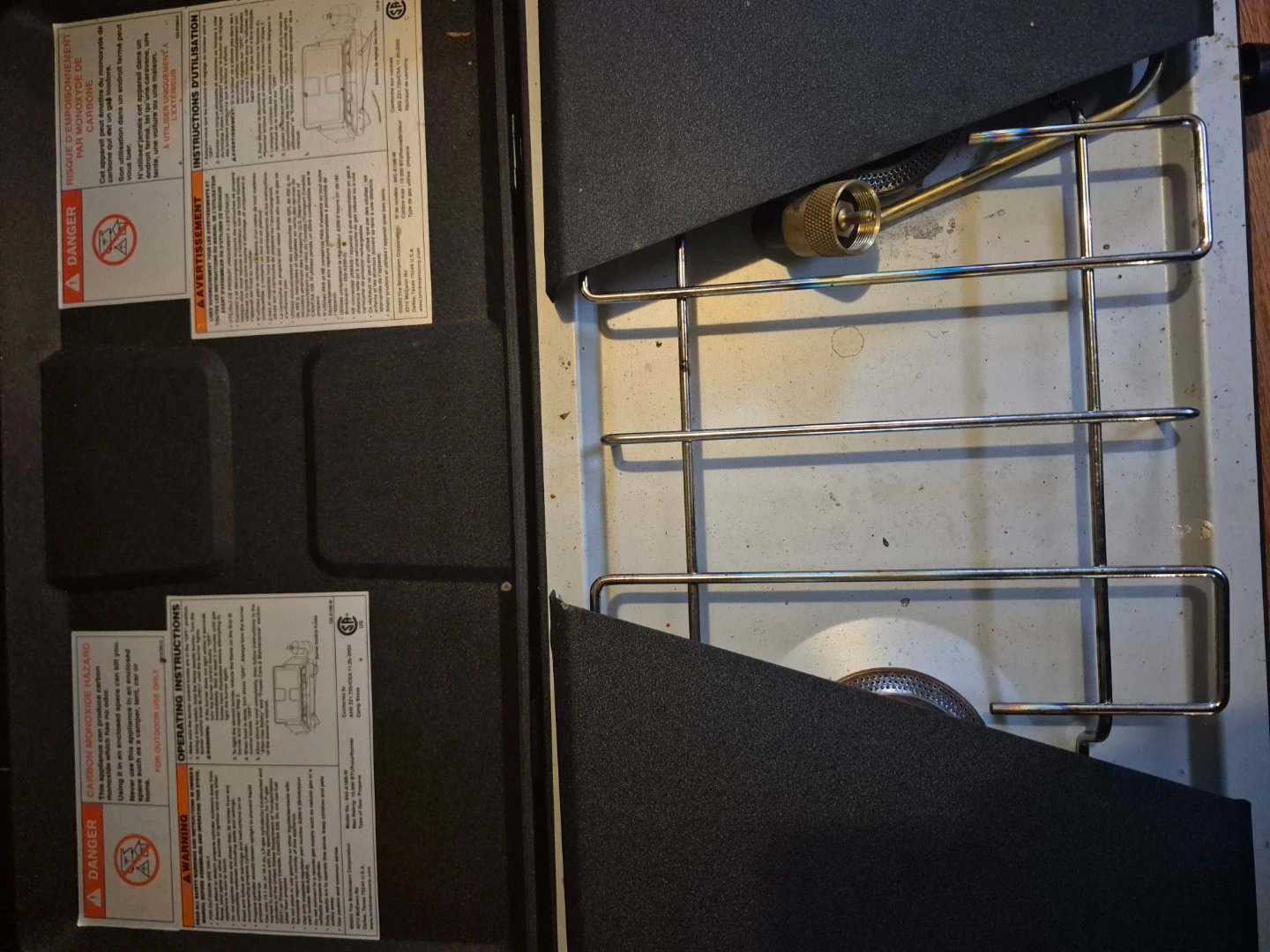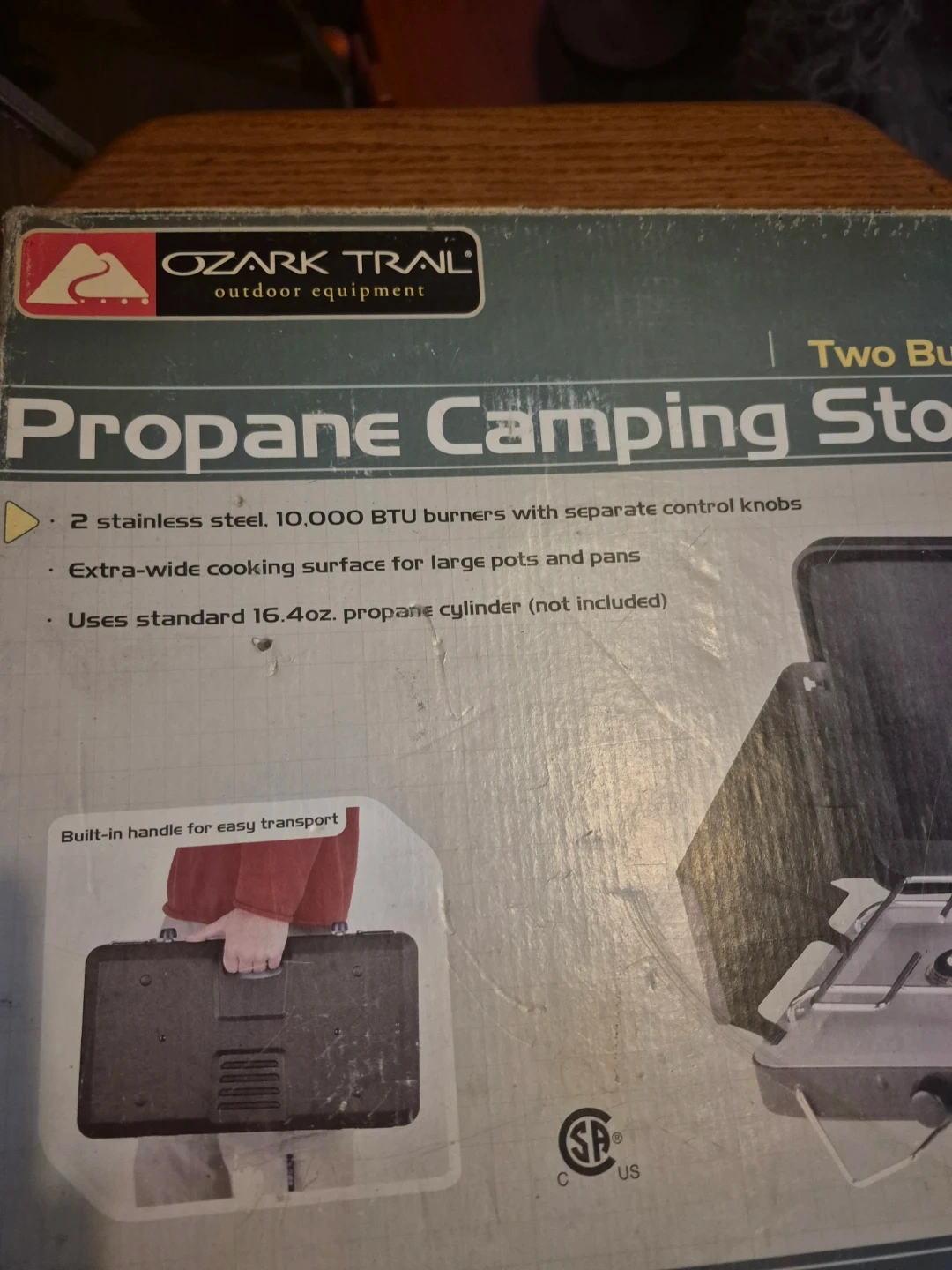 Ozark Trail two burner propane camping stove. 2 stainless steel, 10,000 BTU burners with separate control knobs. Extra-wide cooking surface for large pots and pans. Uses standard 16.4oz. propane cylinder (not included). Built-in handle for easy transport.