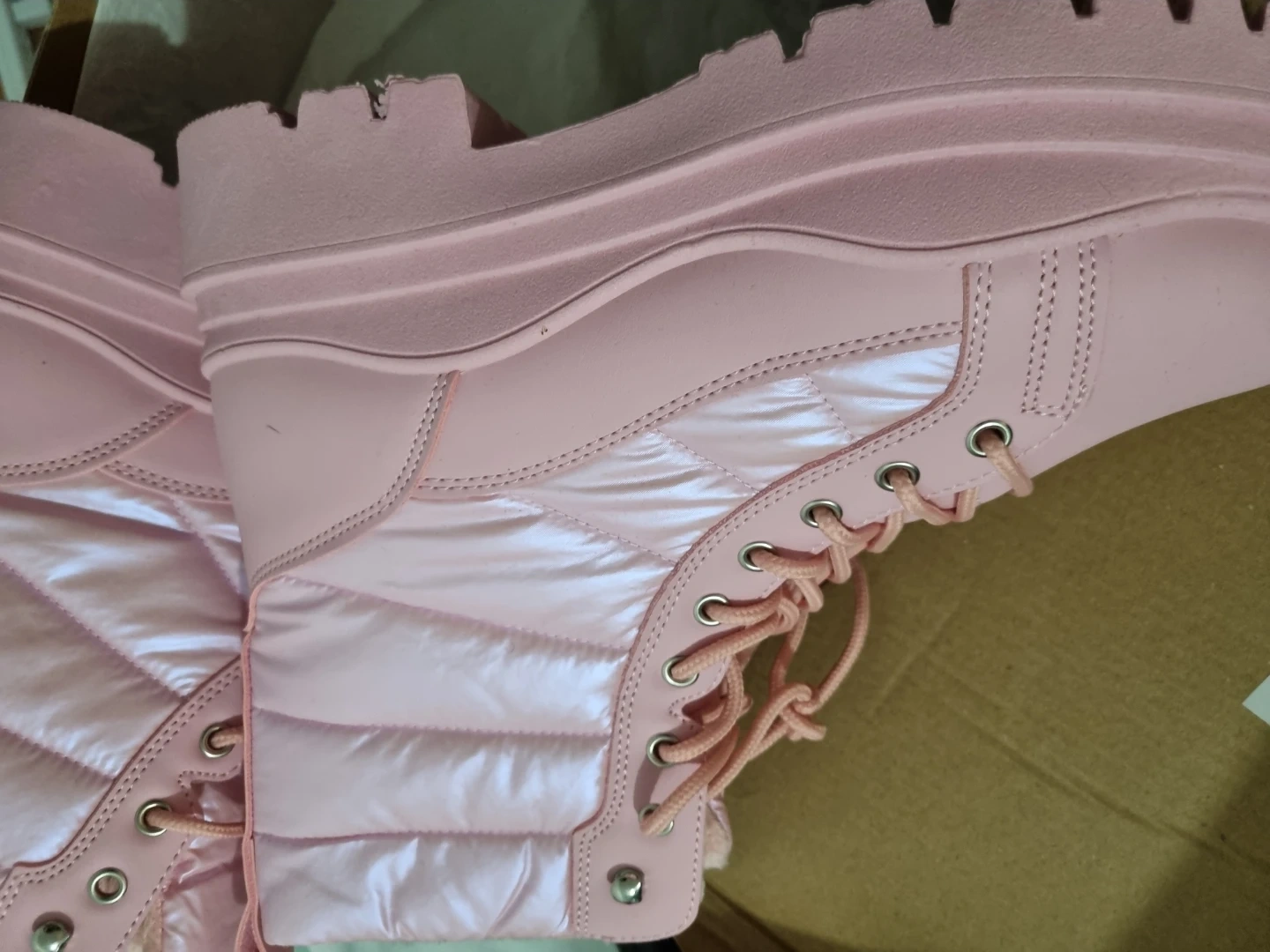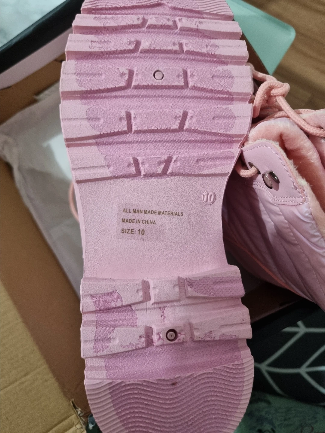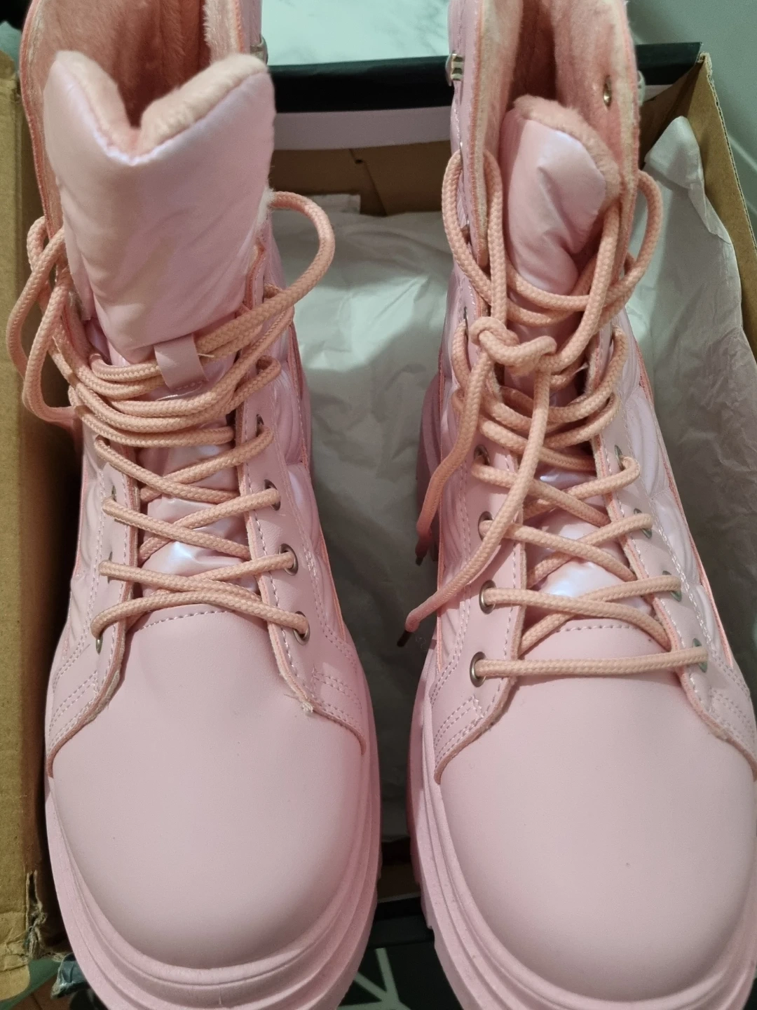 Fashion Nova Pink puffer and faux leather lace-up boots. Made in China. All man-made materials. Size 10.