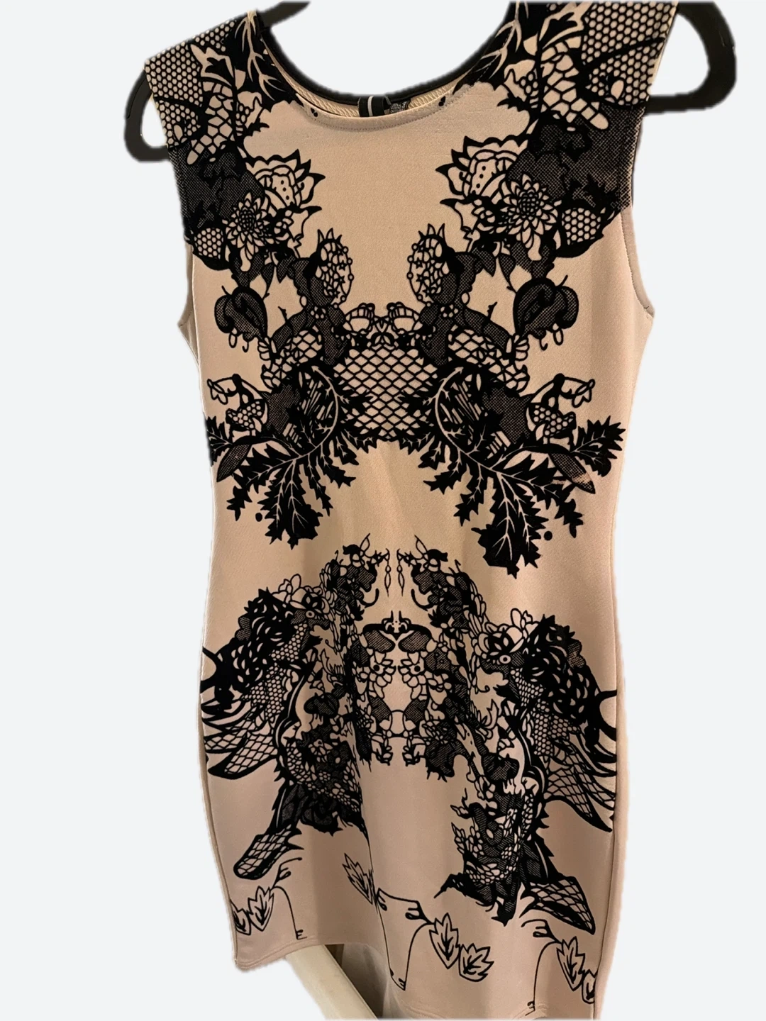 This women's dress features a sleeveless design with a cream-coloured base and intricate black lace-inspired detailing. The fabric is a stretchy blend, offering a comfortable fit. It's suitable for a variety of occasions, from casual outings to semi-formal events.