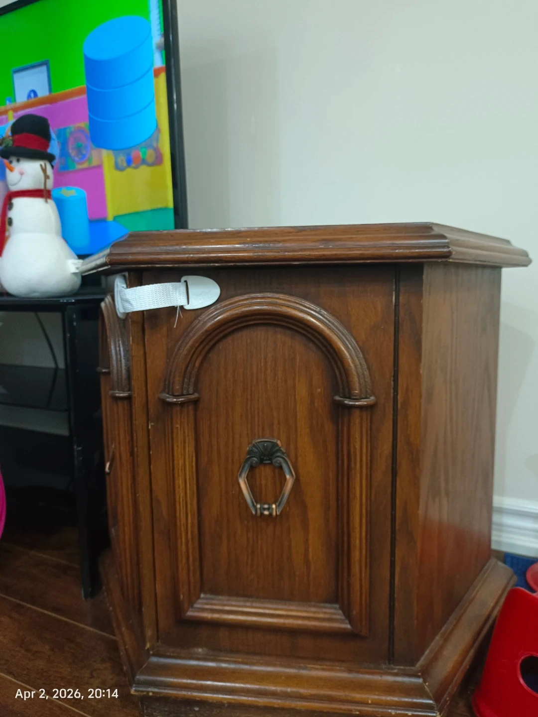 This is a lovely wooden accent cabinet with a single door and a decorative pull handle with storage space. It's made of solid wood with a rich, warm finish. The cabinet's design features arched detailing above the door and fluted sides. It's a compact piece, perfect for adding a touch of vintage charm to any room.
