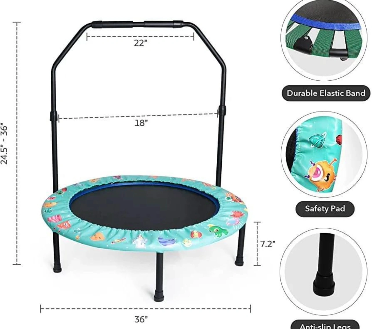Mini Trampoline with Adjustable Handle and Safety Padded Cover Foldable Toddler Trampoline Indoor & Outdoor Rebounder Trampoline for Kids Play and Exercise.