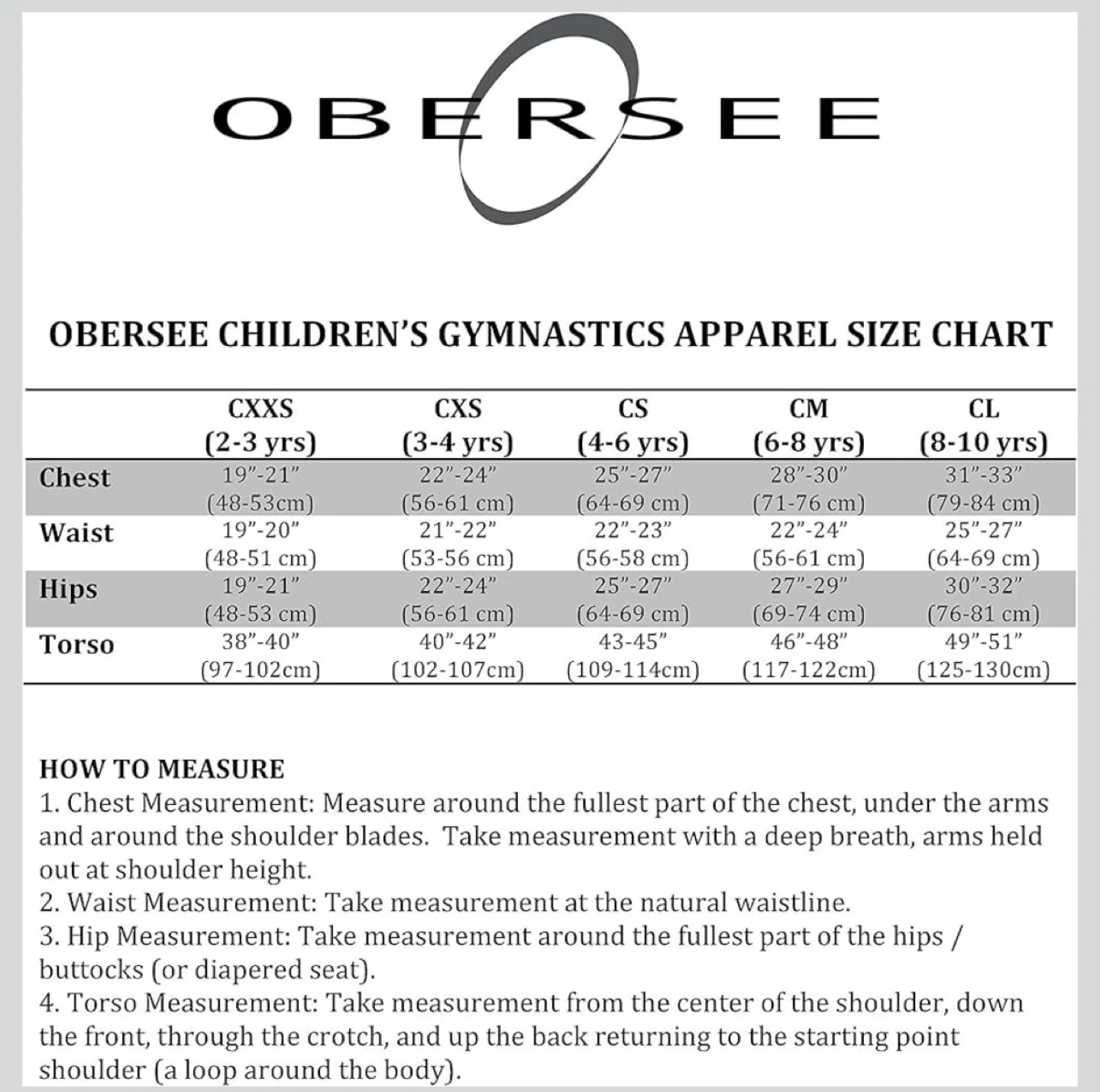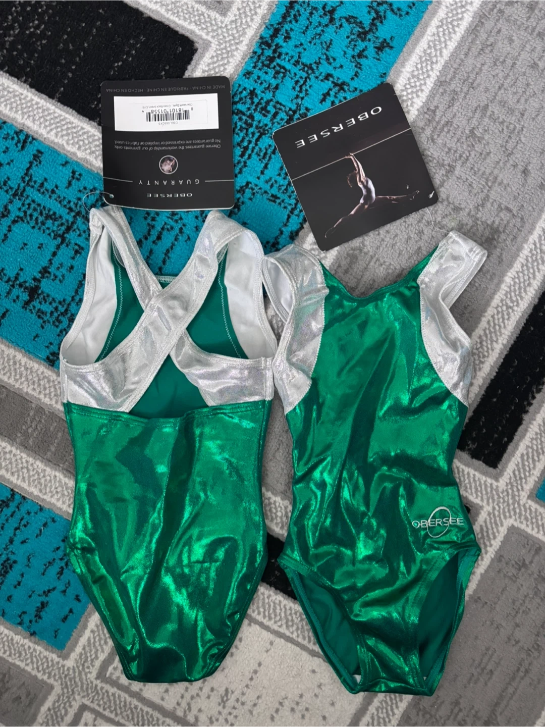 This Obersee children's gymnastics leotard is a sparkly green with silver accents. It's a size CXS, suitable for ages 2-4 years. It features a criss-cross back design. This leotard is great for practice or competition!