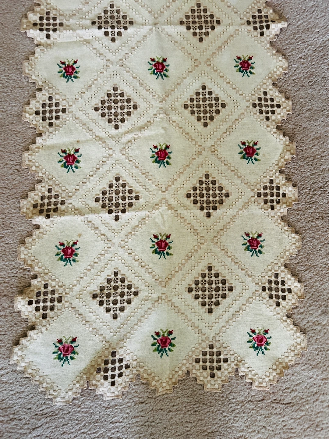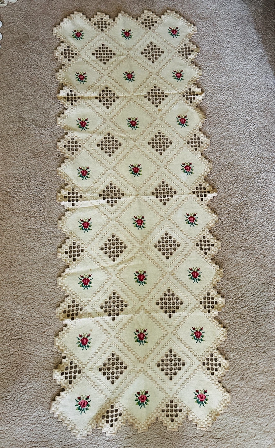 50 by 19-inch VINTAGE Cream-coloured table runner with a beautiful embroidered floral and diamond pattern. It features delicate openwork along the edges for added charm. This runner is perfect for adding a touch of vintage elegance to your dining table or sideboard.