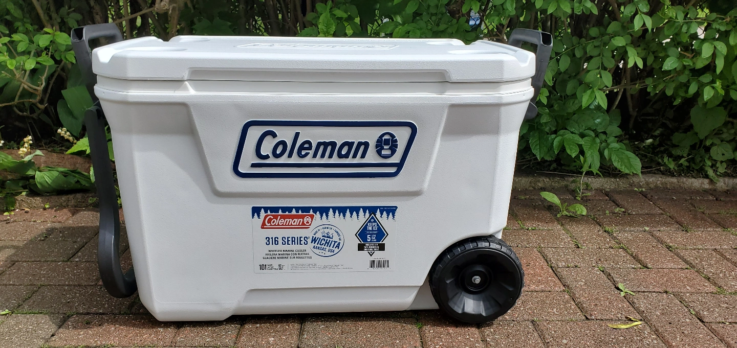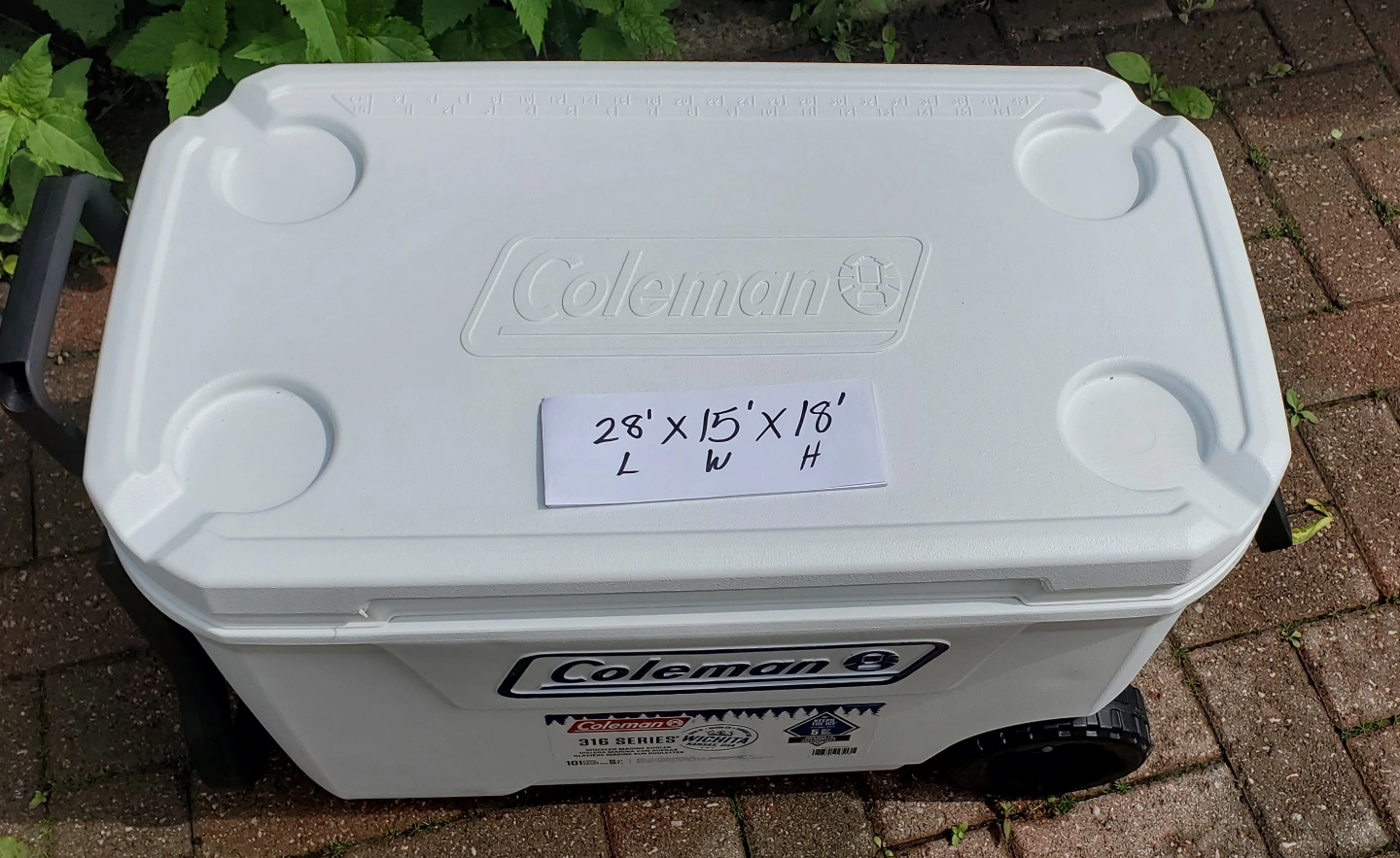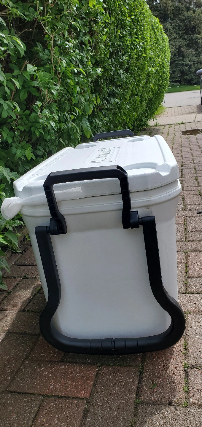 Large capacity cooler. White plastic construction. Features wheels and handles for easy transport. 62 liters. Keeps ice for five days. Contact me for questions. Excellent product. It was used for 4 consecutive days camping. Perfect.