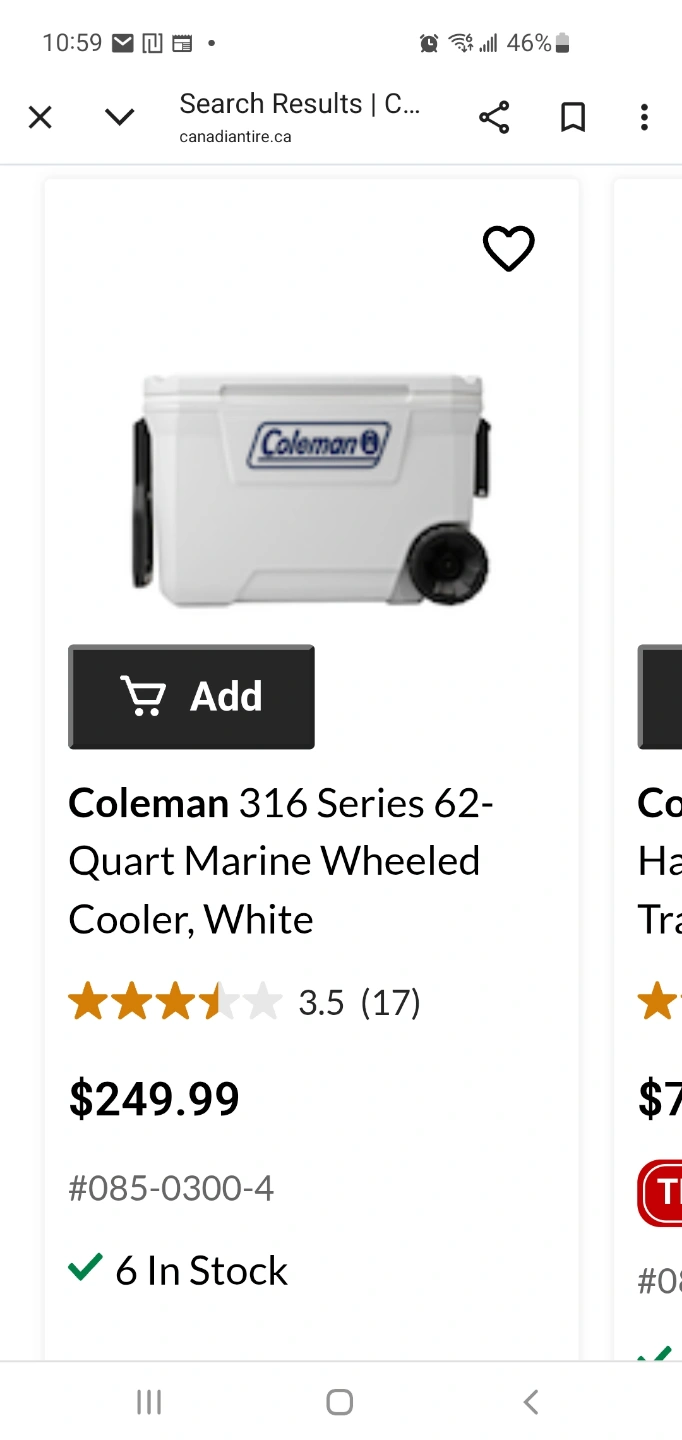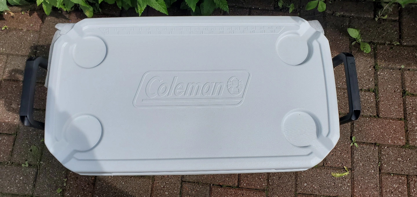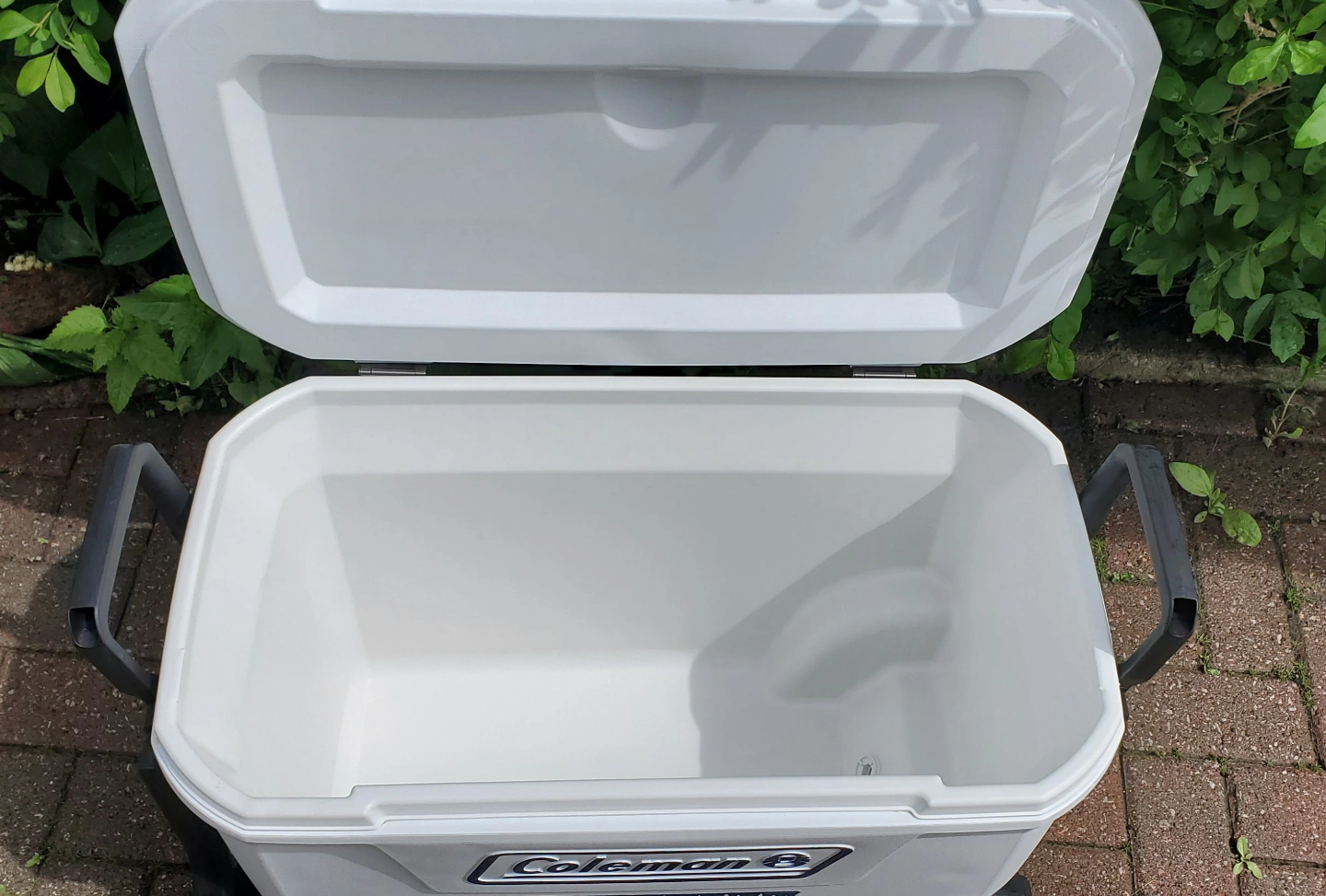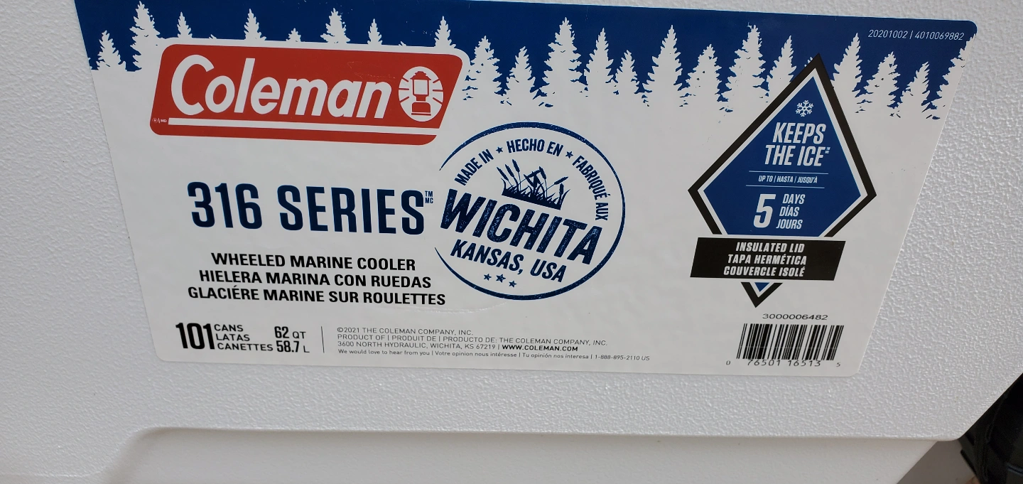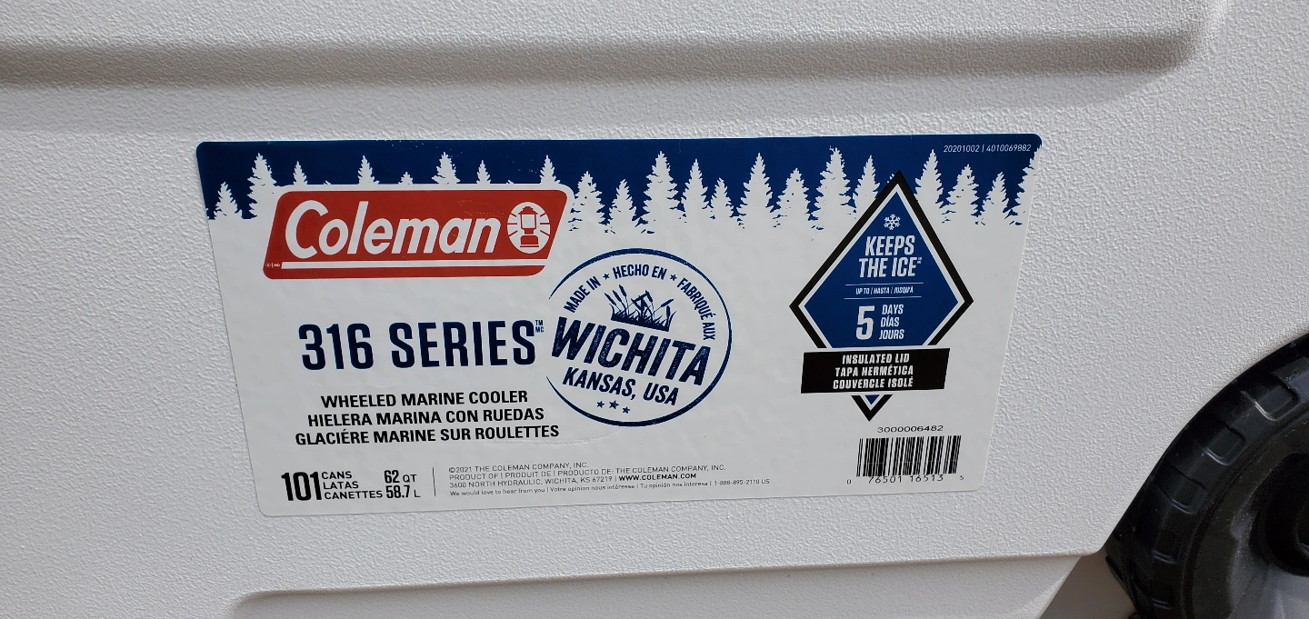 Large capacity cooler. White plastic construction. Features wheels and handles for easy transport. 62 liters. Keeps ice for five days. Contact me for questions. Excellent product. It was used for 4 consecutive days camping. Perfect.