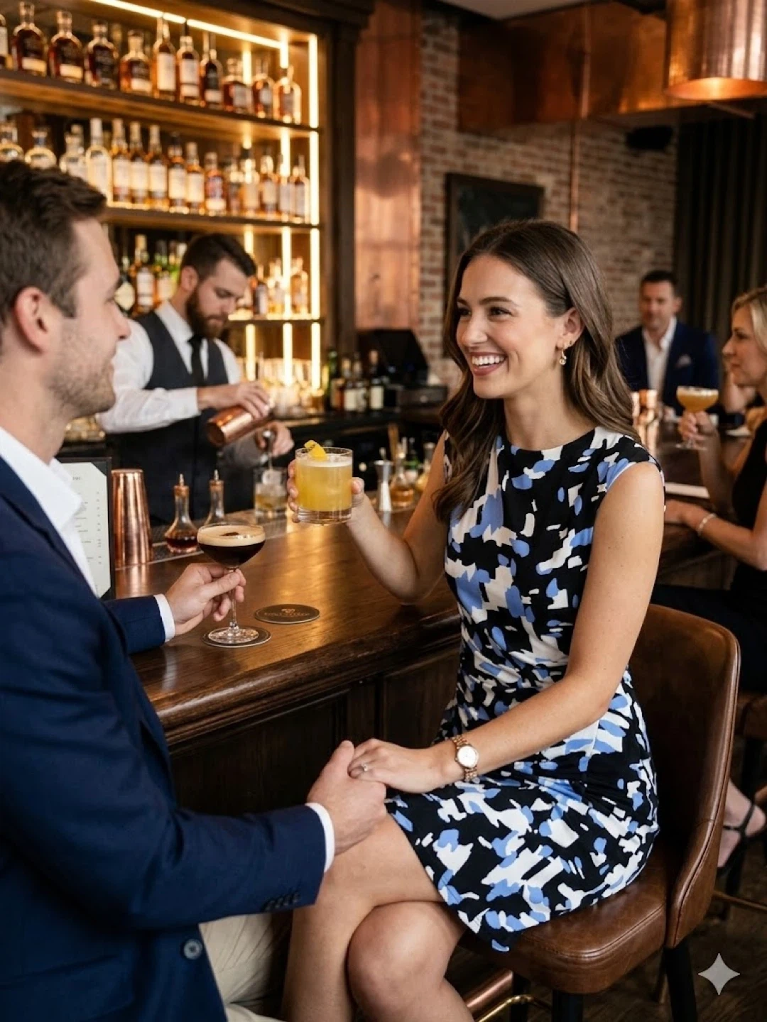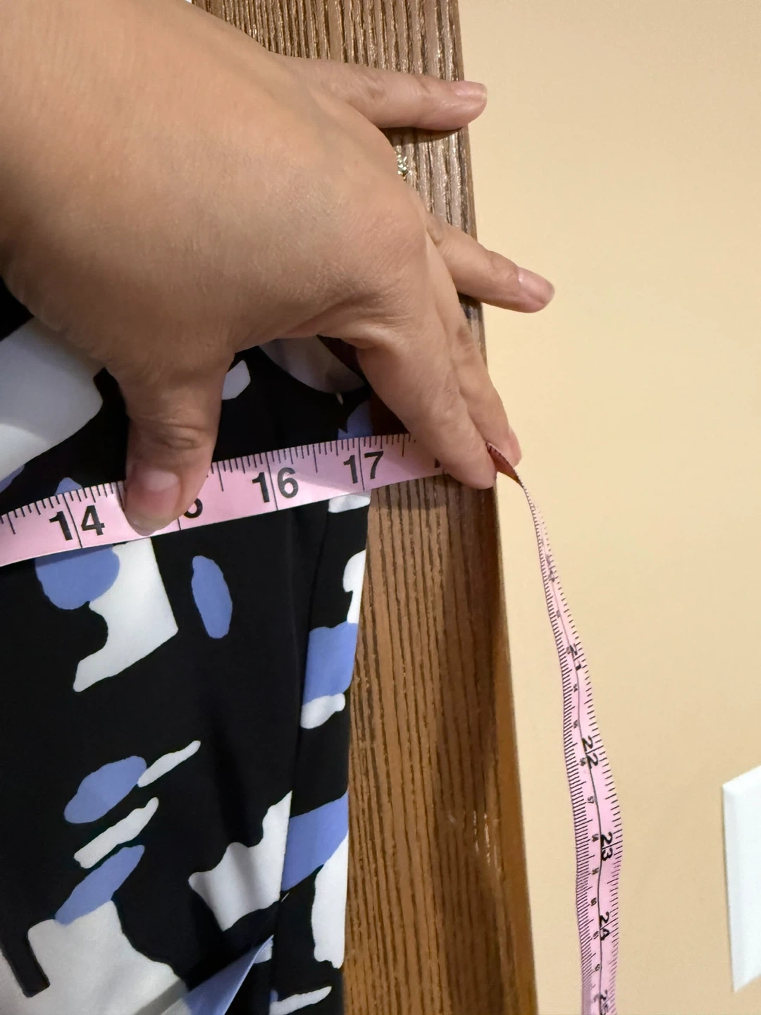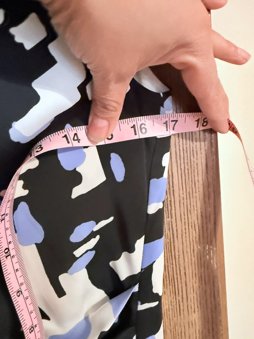 Sleeveless sheath dress from DKNY. Features a black, white, and blue abstract print with ruching on the sides. Measurements are approximately 16" across the chest.