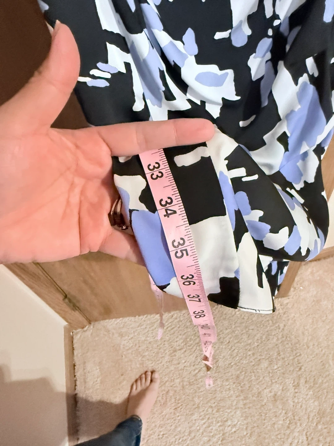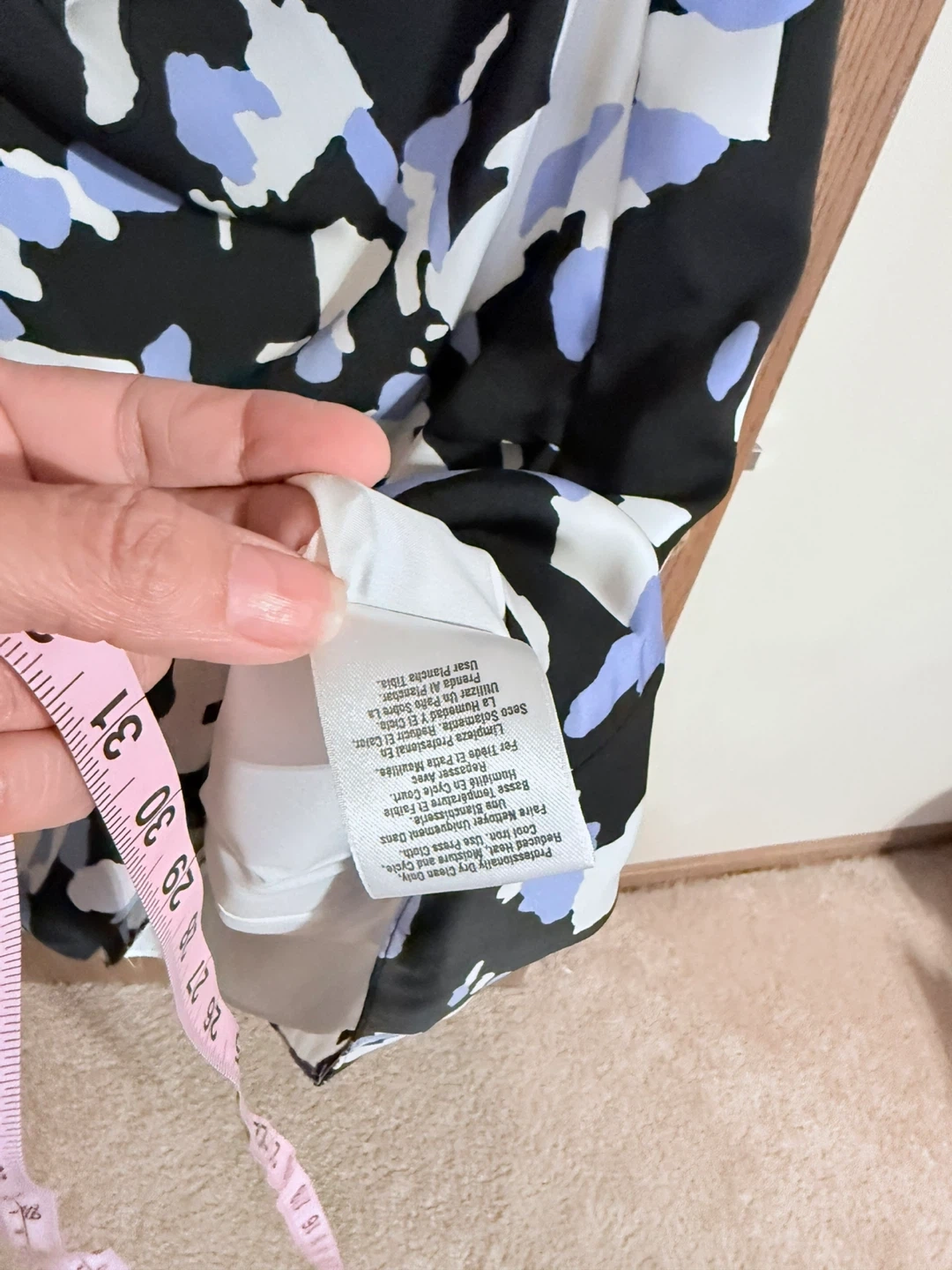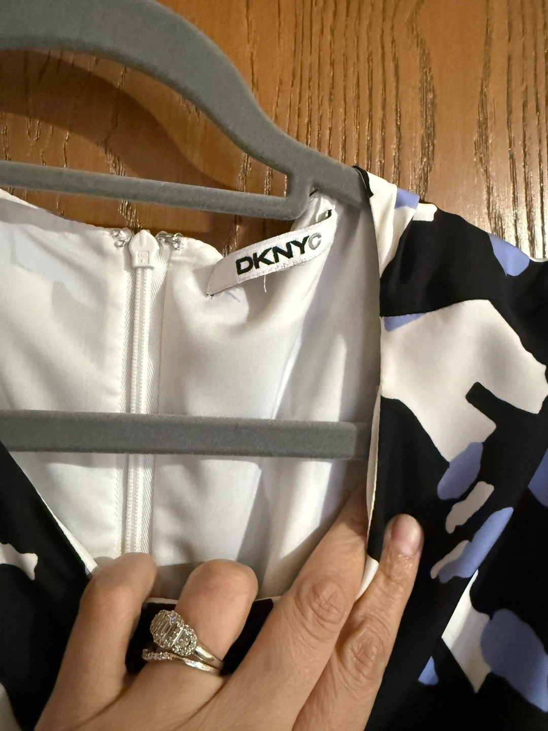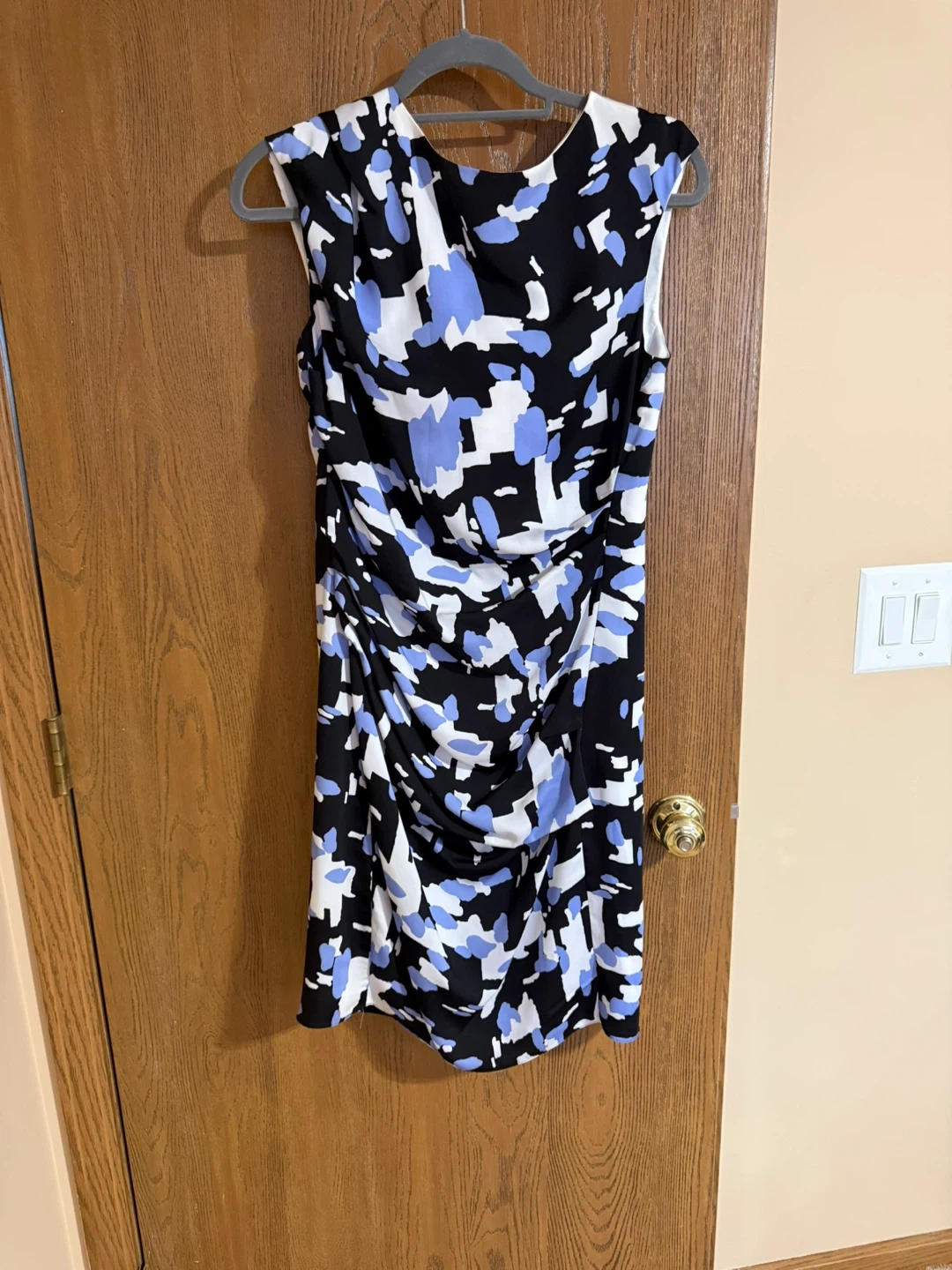 Sleeveless sheath dress from DKNY. Features a black, white, and blue abstract print with ruching on the sides. Measurements are approximately 16" across the chest.