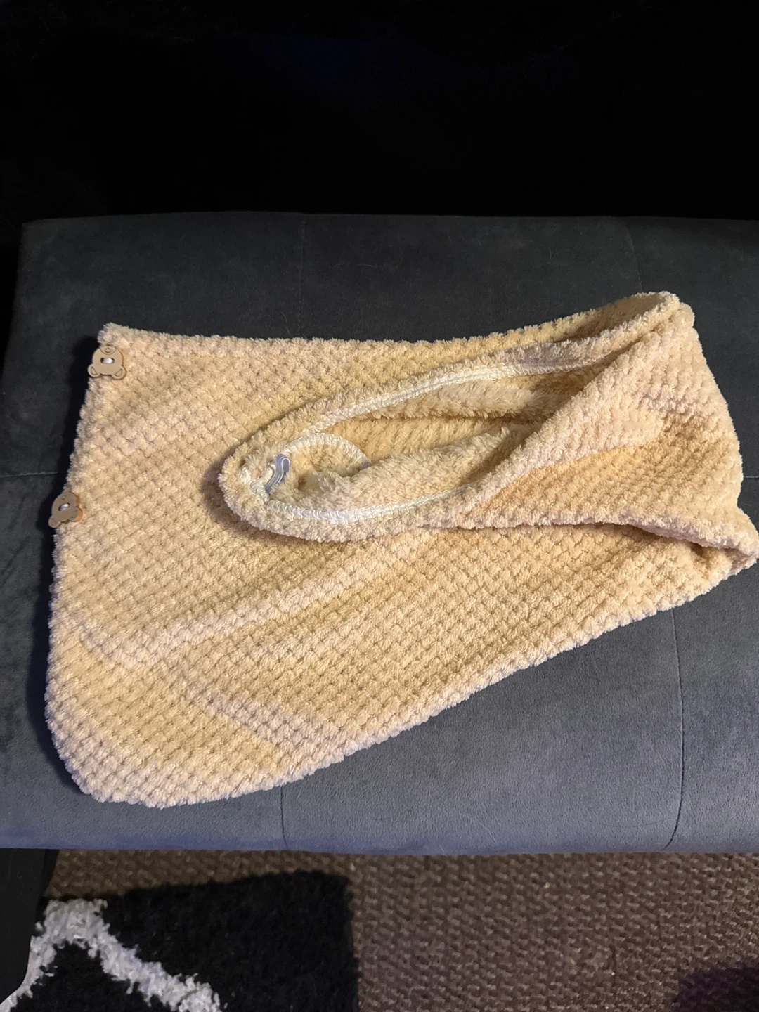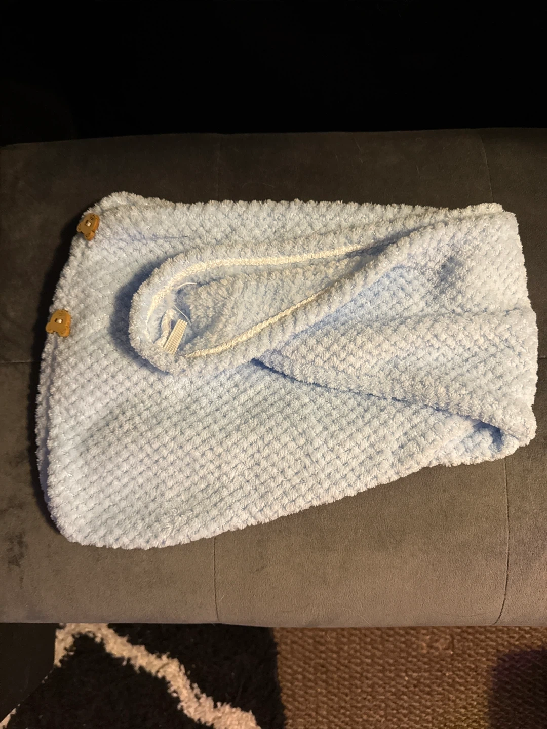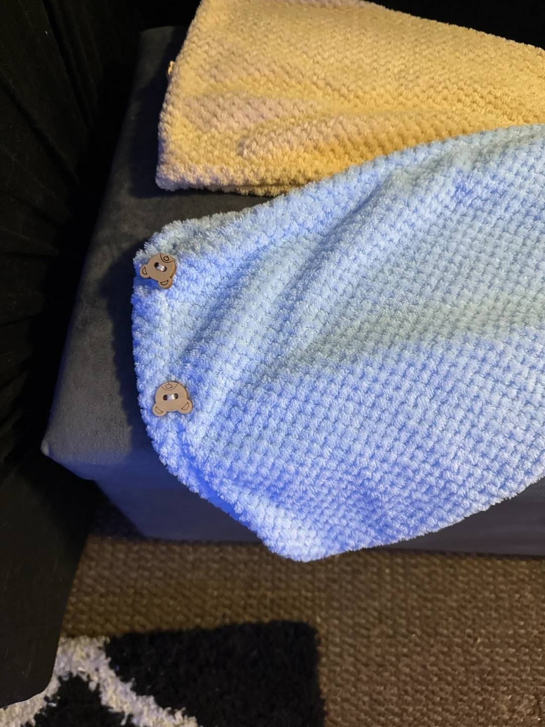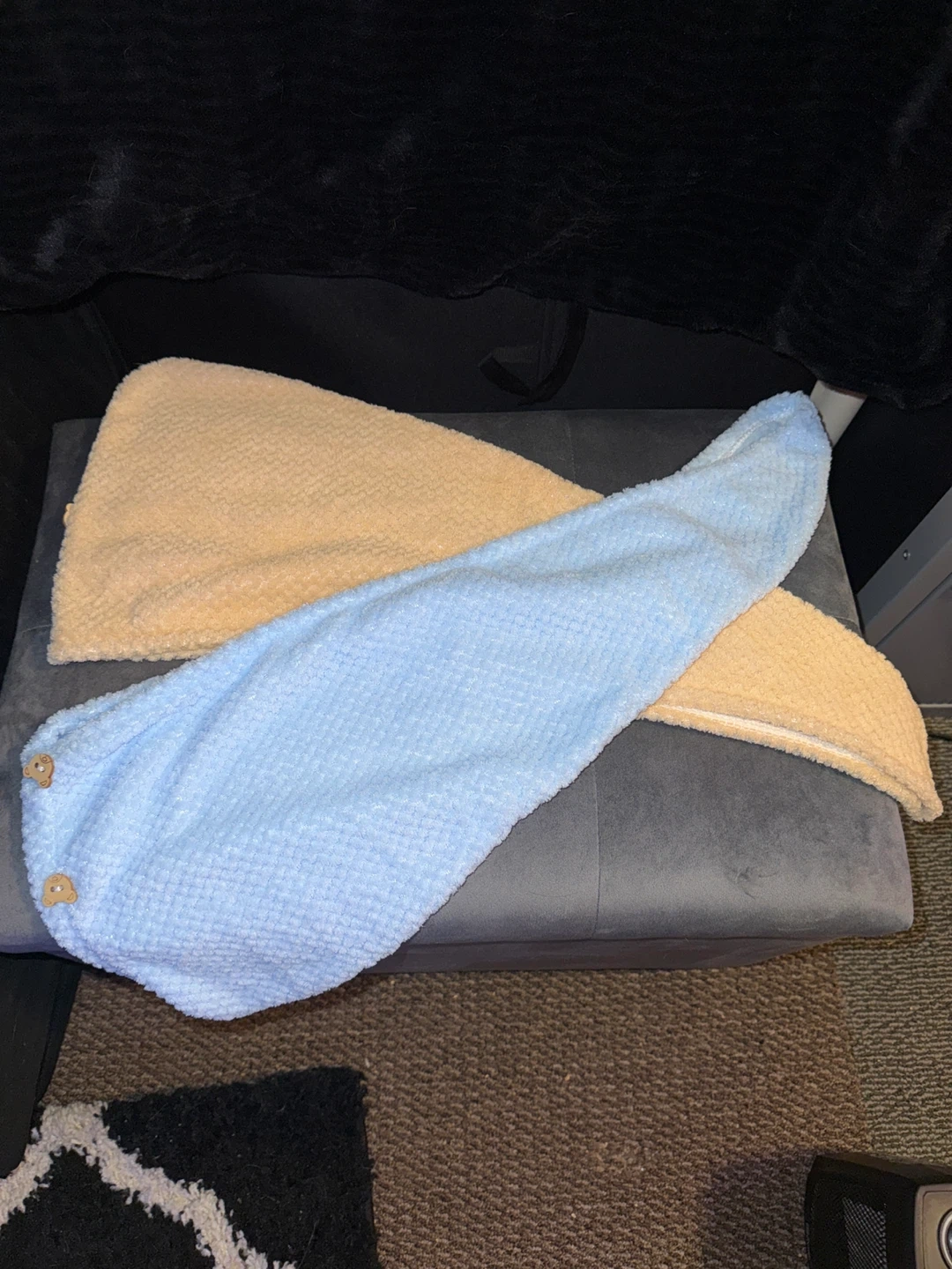 Brand new never used Set of two fluffy microfiber hair towel wraps. Features a soft, absorbent material with cute bear button closures. Includes one light blue and one pale yellow towel. Quick-drying and gentle on hair!