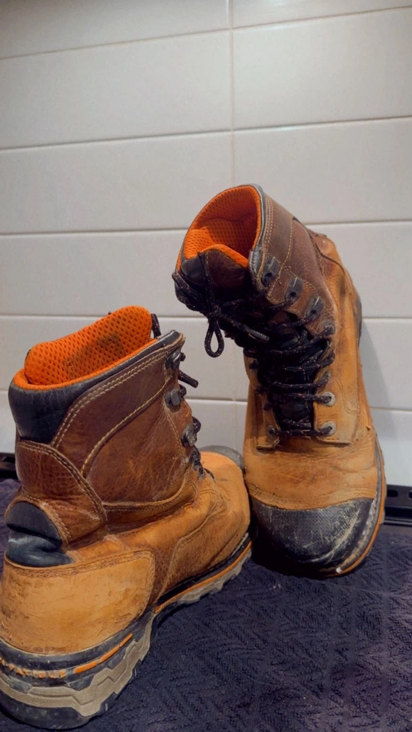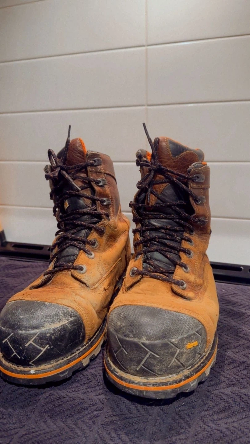 Selling a pair of Timberland work boots. They are brown leather and waterproof. They show signs of use but they are still in good condition.