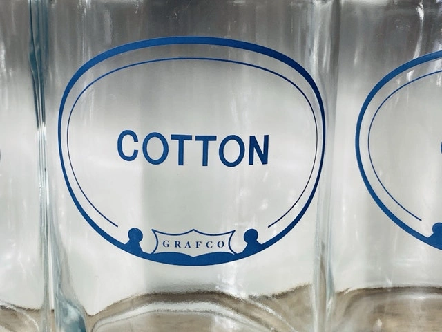 Set of 5 vintage GRAFCO (The Graham-Field Co.) glass doctor’s examination room sundry jars with stainless chrome lids. Labelled “Bandages”, “Tongue Depressors”, “Applicators”, “Cotton” and “Gauze”. Each jar measures approximately 7” tall by 4” wide.
