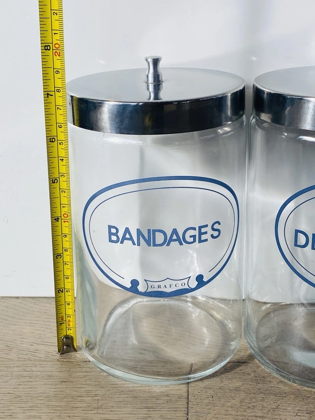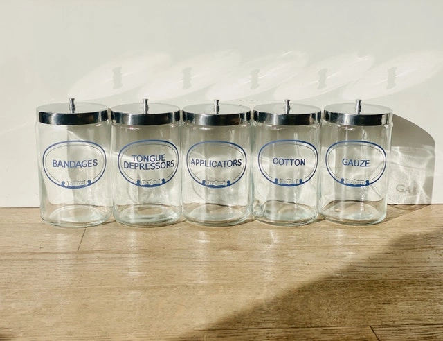 Set of 5 vintage GRAFCO (The Graham-Field Co.) glass doctor’s examination room sundry jars with stainless chrome lids. Labelled “Bandages”, “Tongue Depressors”, “Applicators”, “Cotton” and “Gauze”. Each jar measures approximately 7” tall by 4” wide.