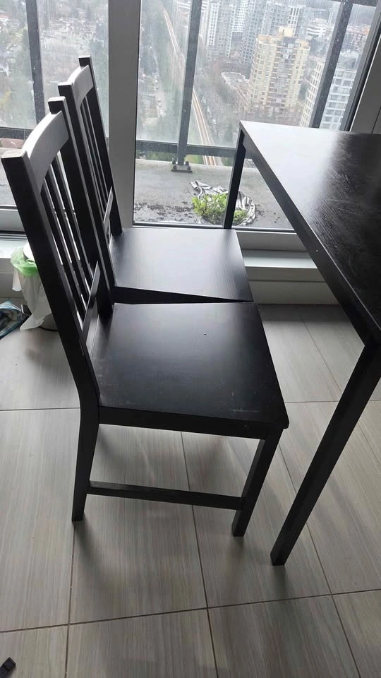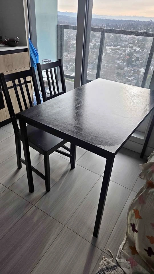 Compact black dining table and two matching chairs. Great for small spaces. Rectangular table. Chairs have slatted backs.