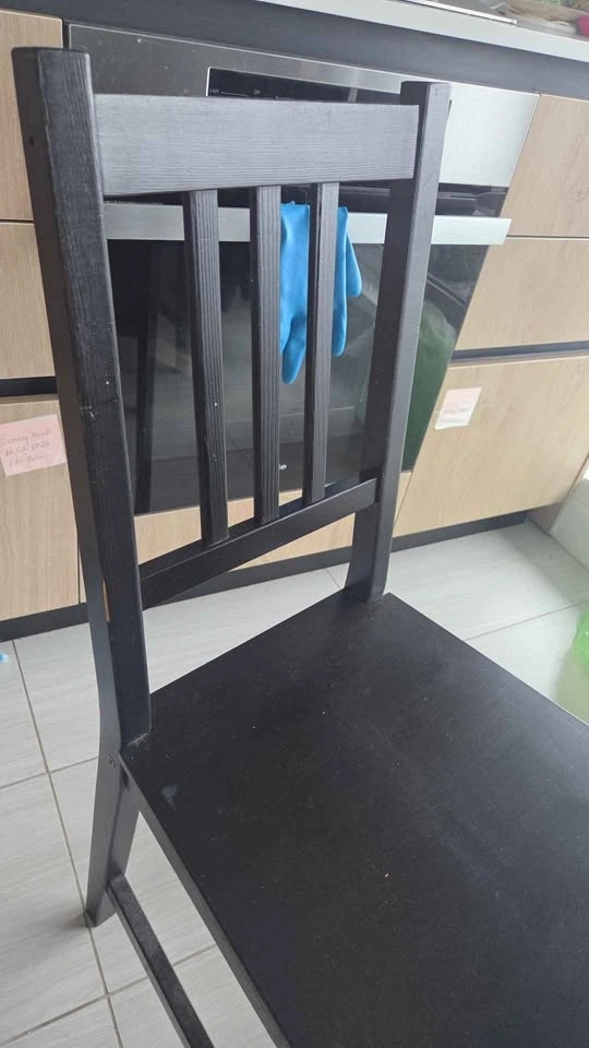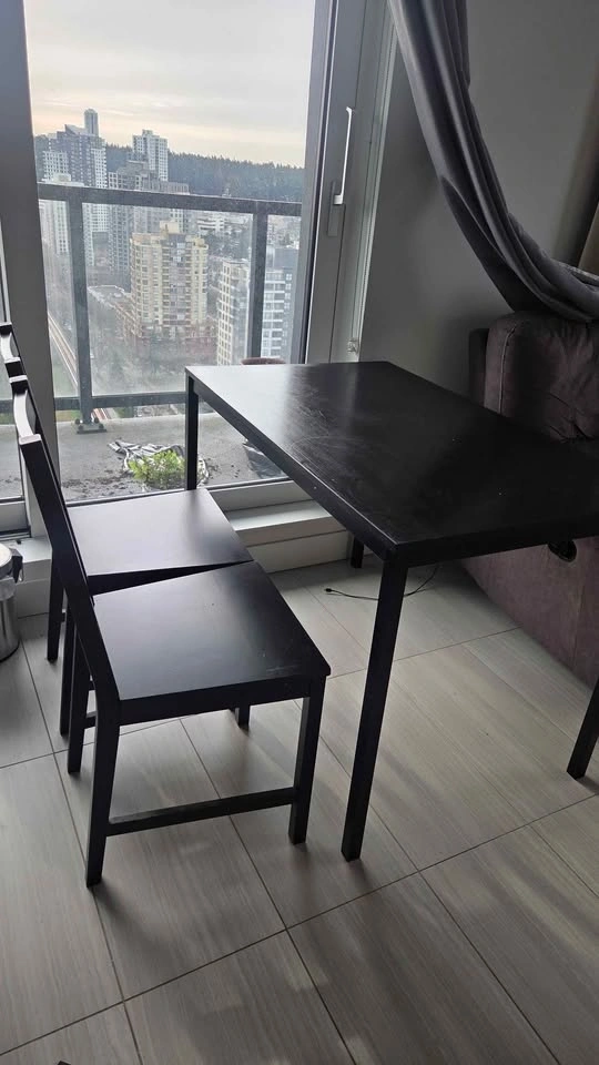 Compact black dining table and two matching chairs. Great for small spaces. Rectangular table. Chairs have slatted backs.