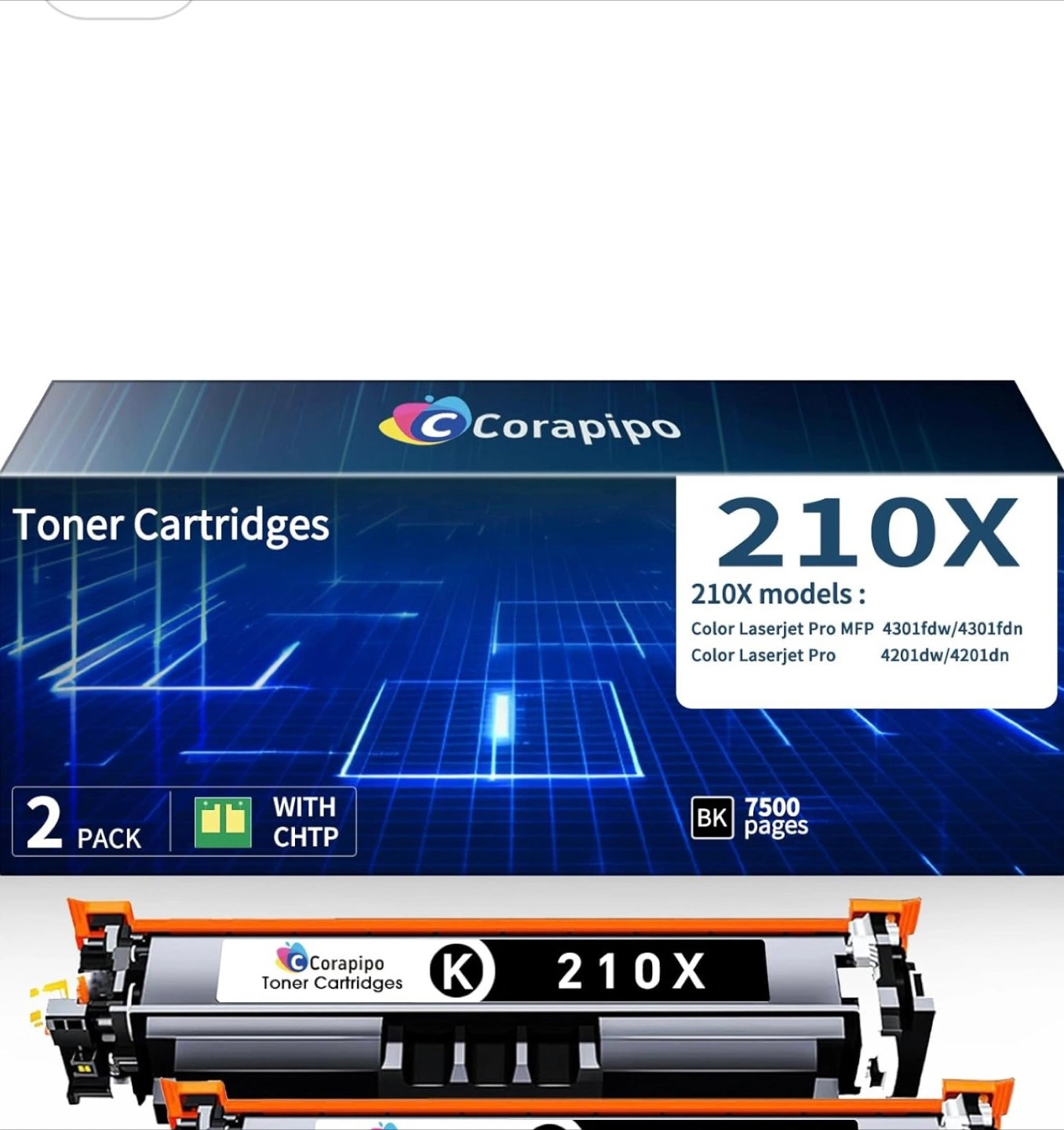Selling a 2-pack of Corapipo 210X black toner cartridges. These are high-yield cartridges, with each capable of printing up to 7500 pages. They're compatible with Color Laserjet Pro MFP 4301fdw/4301fdn and Color Laserjet Pro 4201dw/4201dn series printers. Easy to install with step-by-step instructions included!
