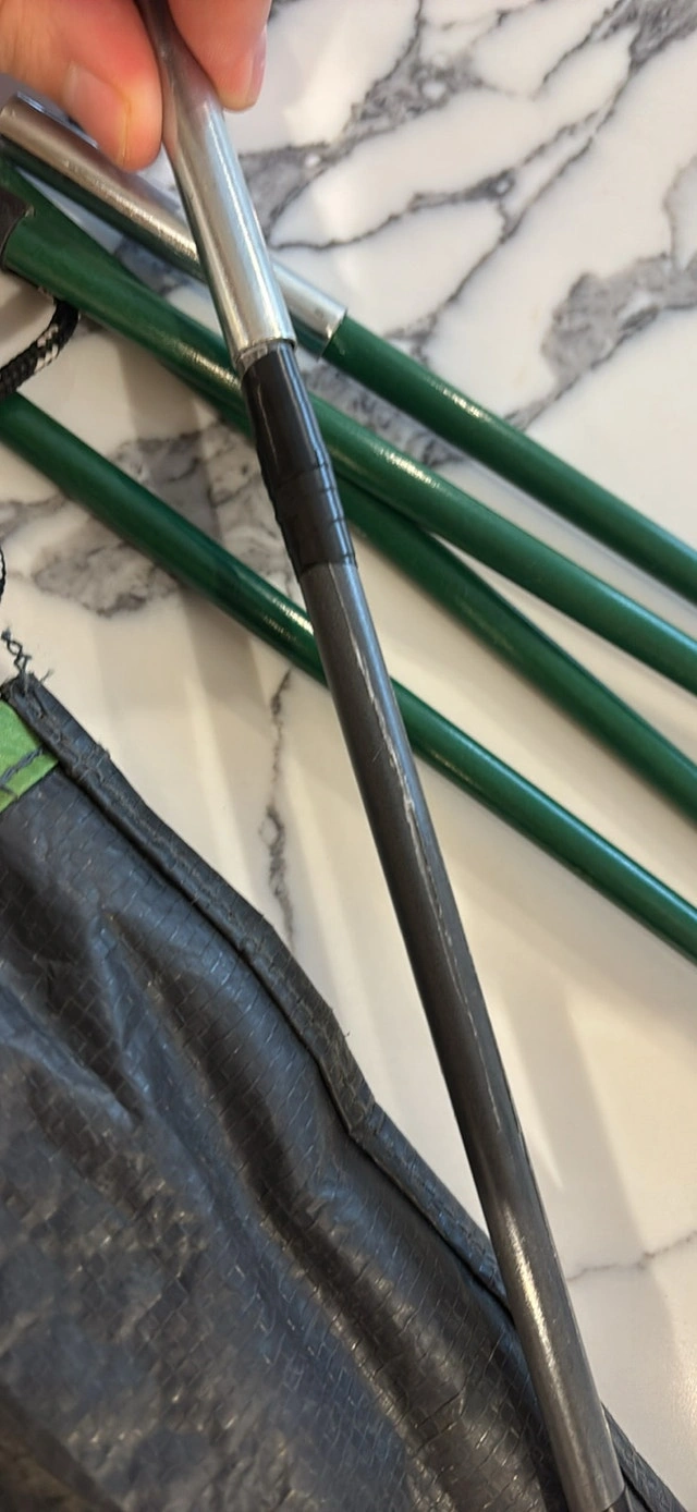 Front tent pole is cracking but is taped up and still works fine. The tent itself is in good condition with no holes.