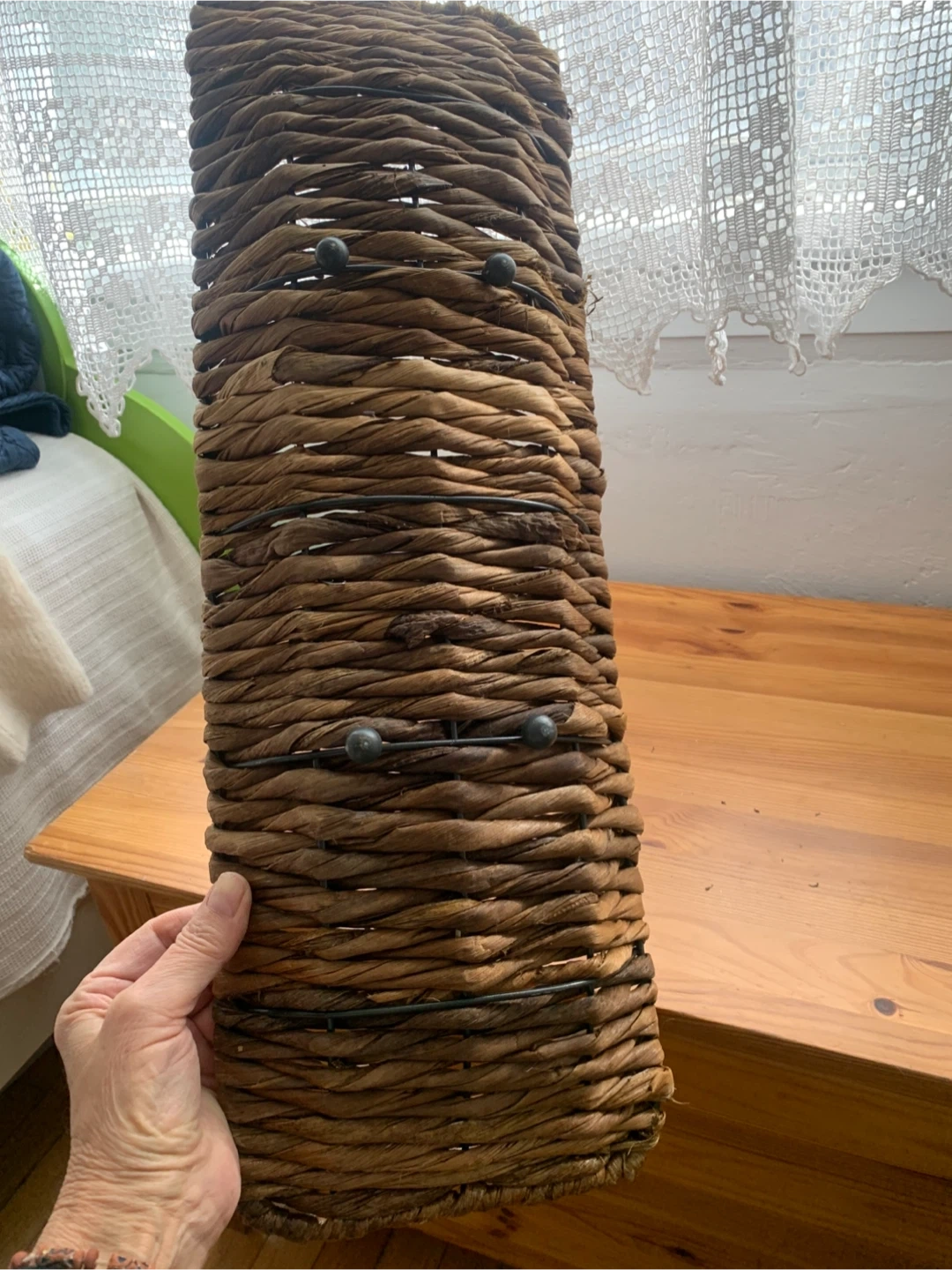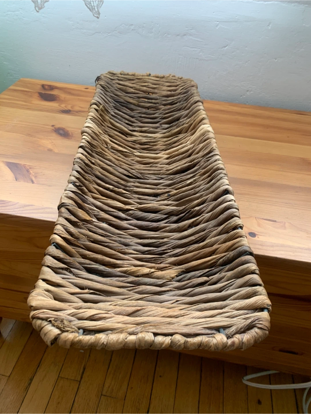 Long, rectangular woven centrepiece or table runner. It's made from natural fibres and has a rustic look. This piece can be used to add a decorative touch to dining tables or as a display base.