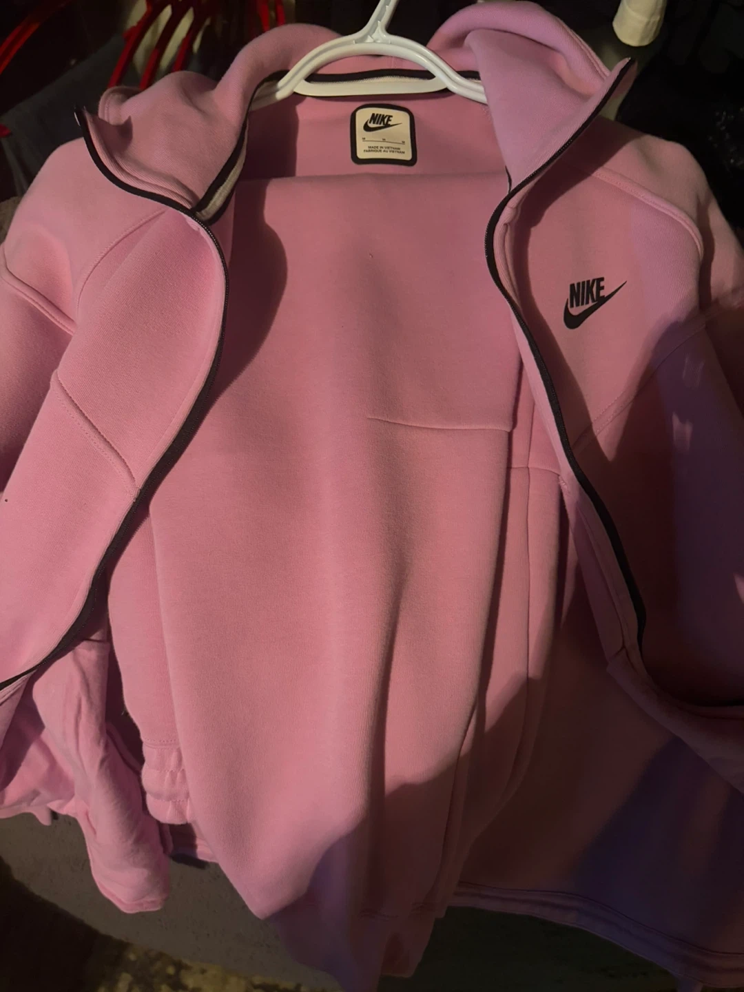 This is a pink Nike Tech Fleece hoodie and pants set. It's a size medium. The material is a soft blend, perfect for casual wear.