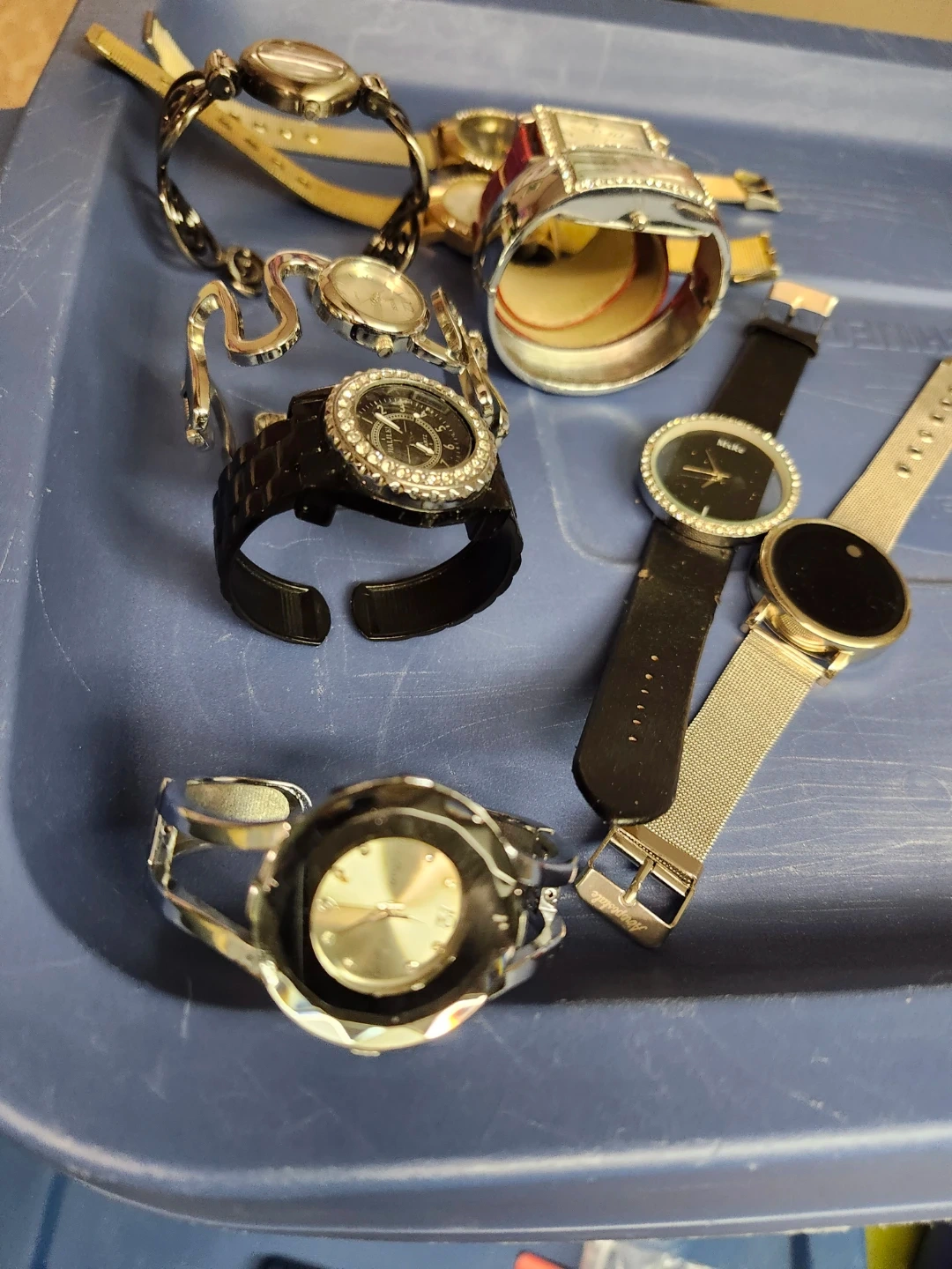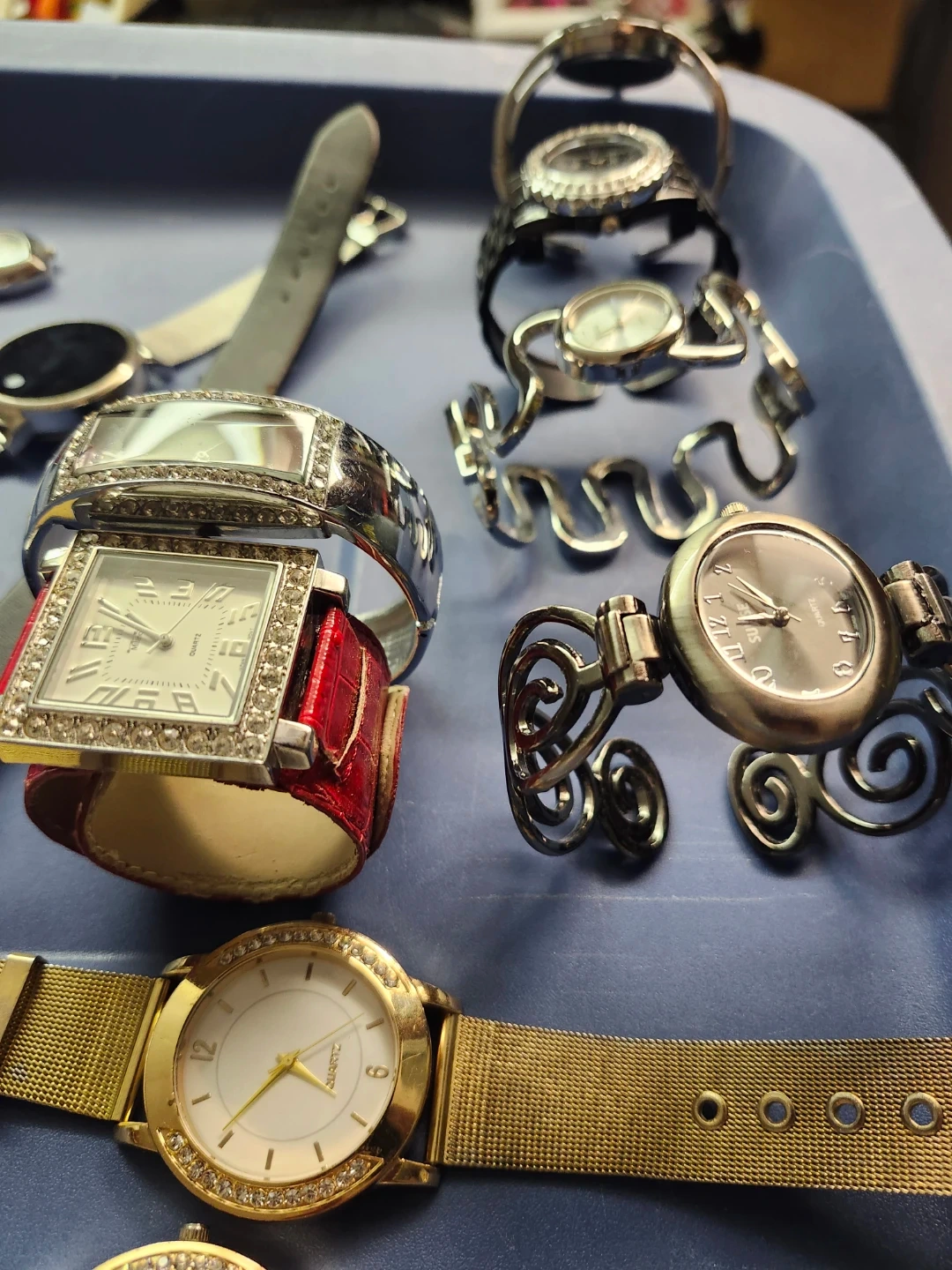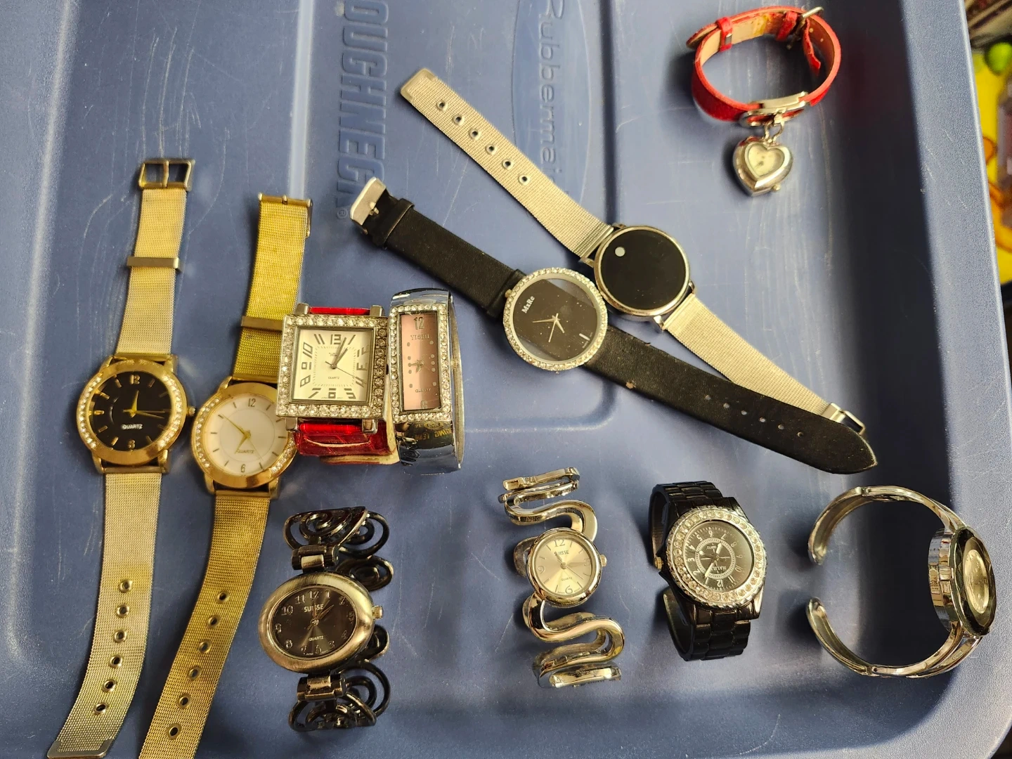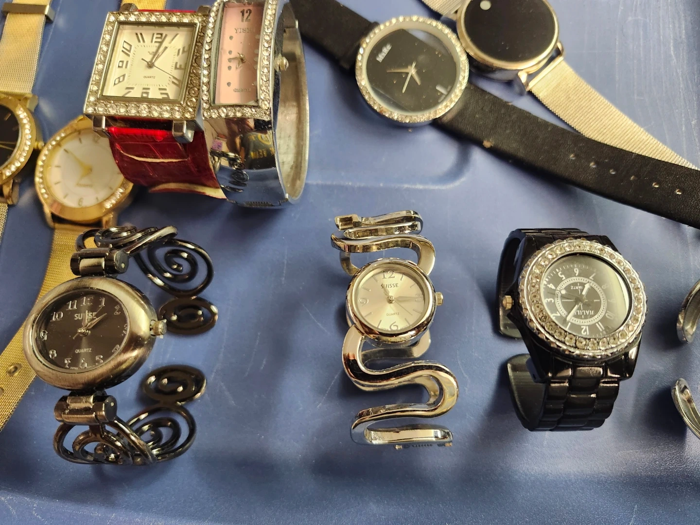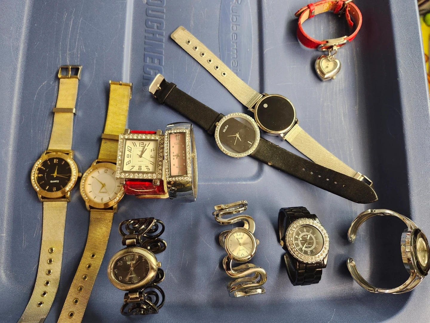 Collection of 11 assorted women's fashion watches. Includes various styles with metal bands, some with rhinestone accents. Watches have round and square faces, some with colourful accents.