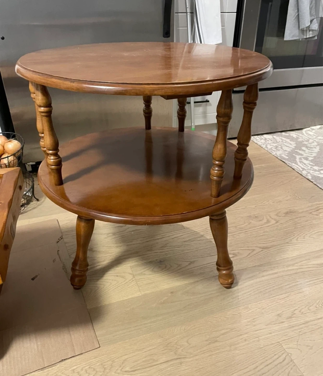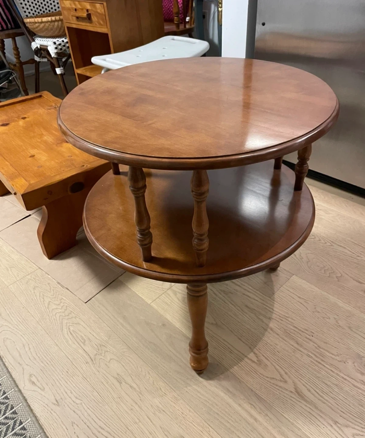 This is a lovely two-tier round end table with a warm wood finish. It's made entirely of wood and offers a classic design that'll fit well in any living room. Perfect for holding a lamp, drinks, or your favourite books!