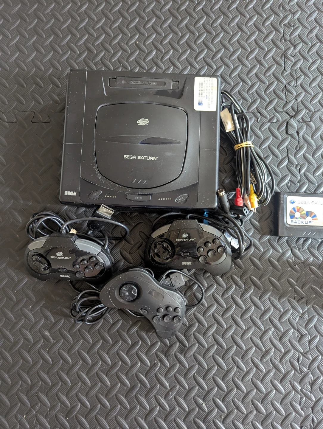 Selling a Sega Saturn console! Includes the console itself, three controllers, and all the necessary cables to get you gaming. A backup memory cartridge is also included!