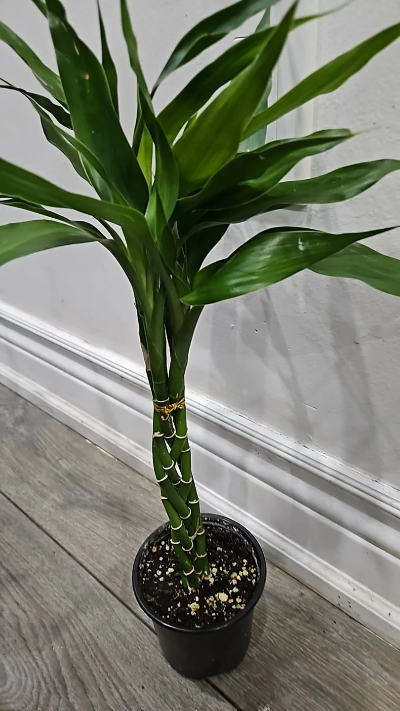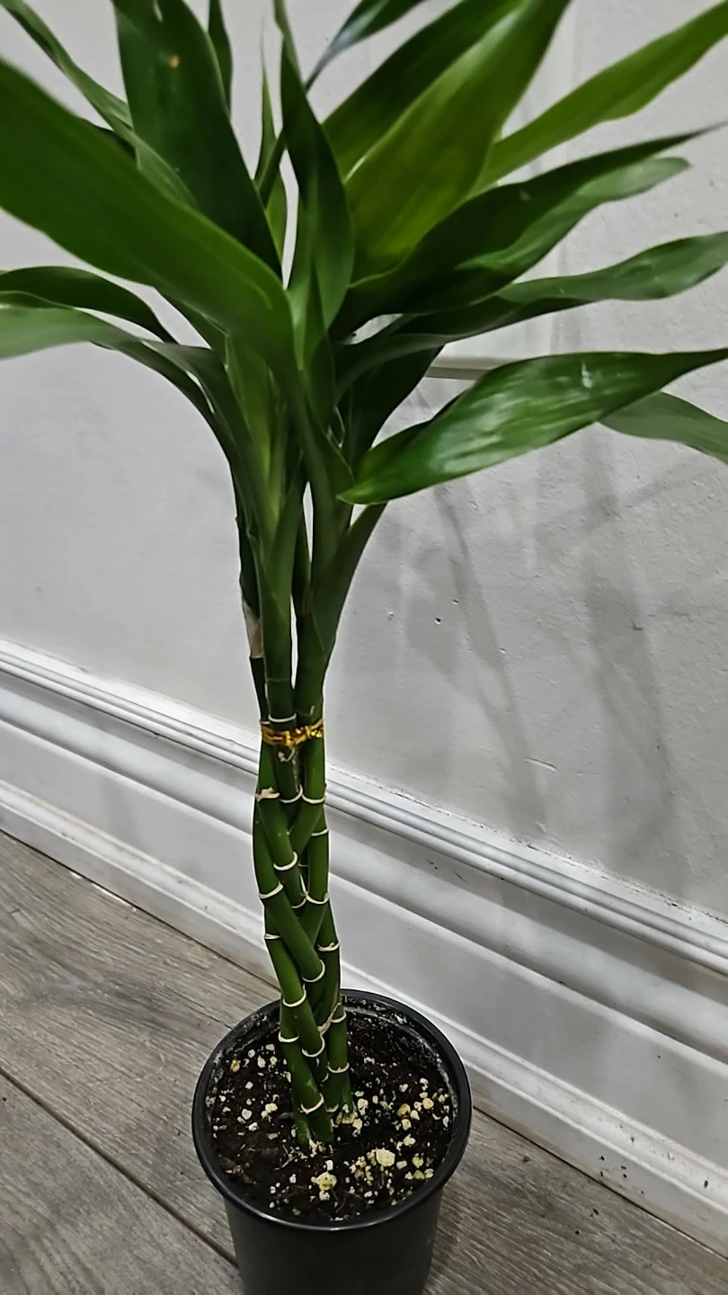 A live lucky bamboo plant with a unique braided trunk. It's potted in a black plastic container with soil. These plants are easy to care for and can add a touch of green to any room!