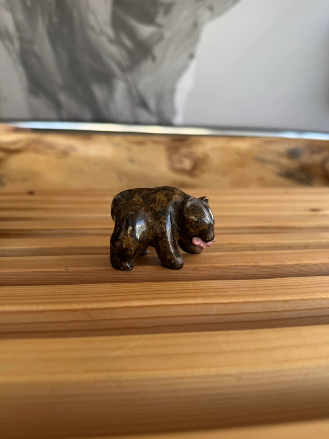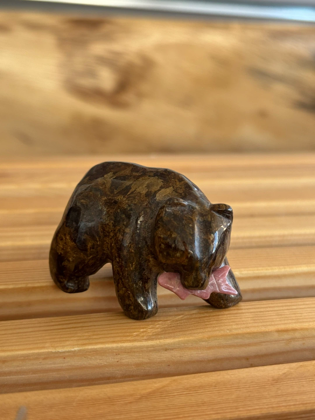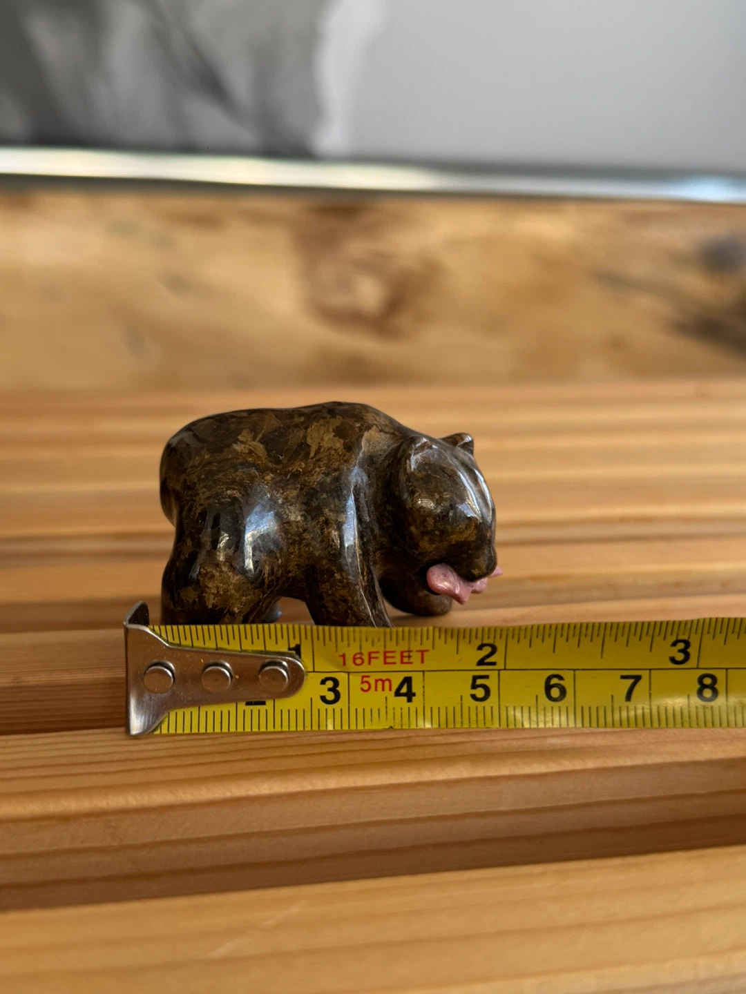 Here's a cute little brown stone bear figurine! It measures approximately 3 inches in length. It would make a great addition to any collection or a sweet gift