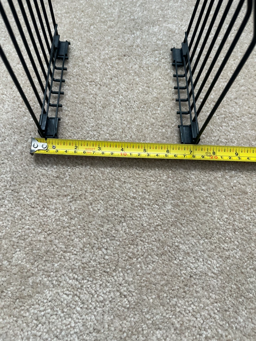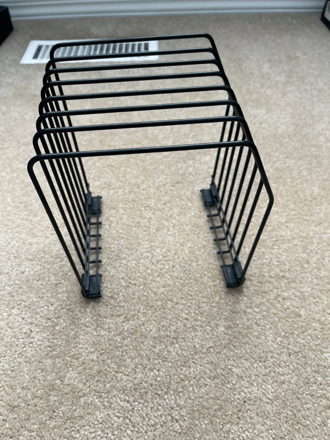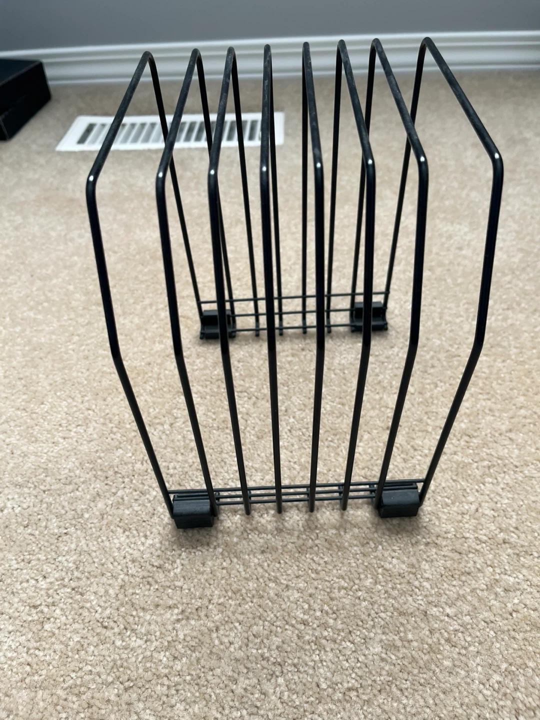 This is a black metal magazine file holder. It has six slots for organizing papers or magazines. Measures approximately 13 inches long and 7 inches tall.