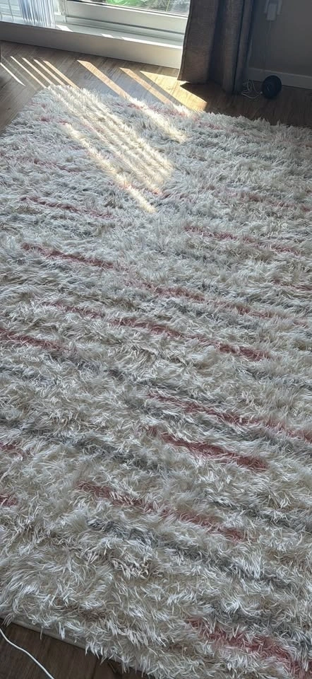 This Christian Siriano New York multi shag area rug measures 5'2" x 7'2". It's made with a polyester and polypropylene backing. Pet free smoke free home!